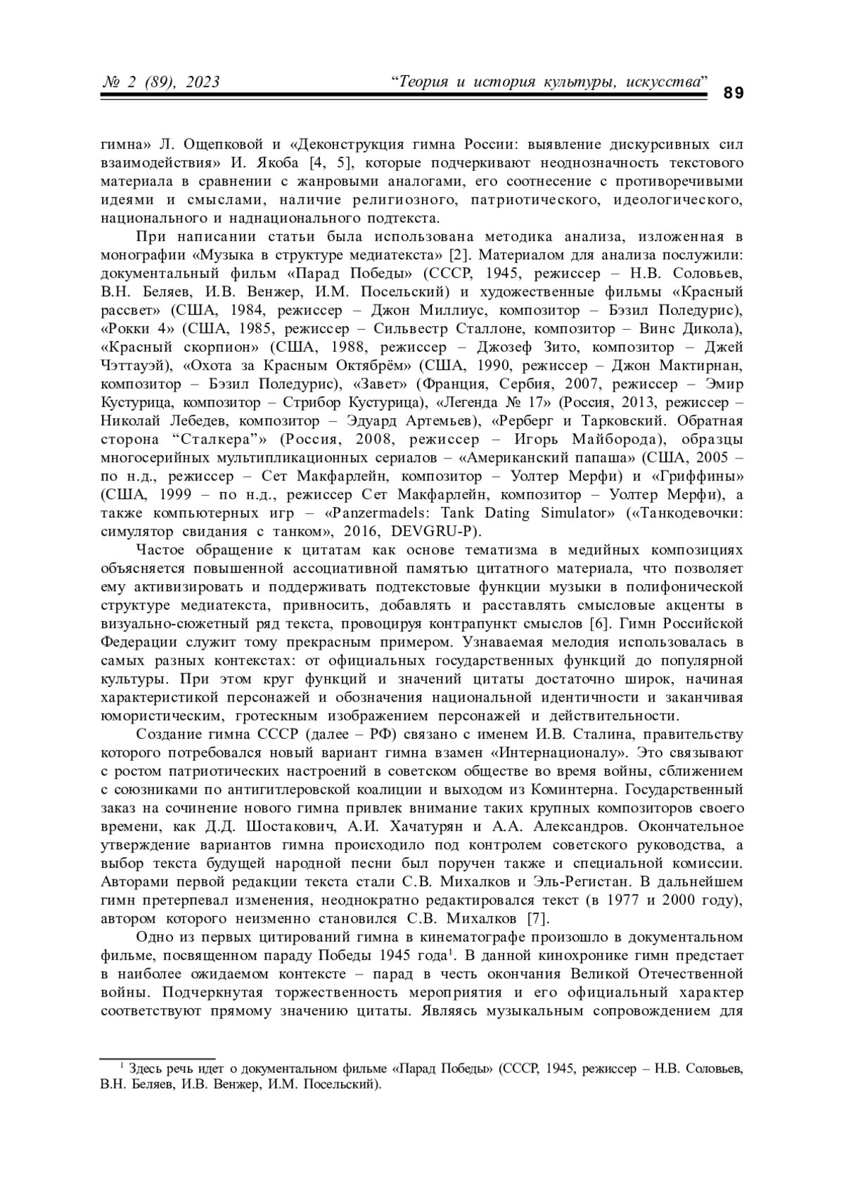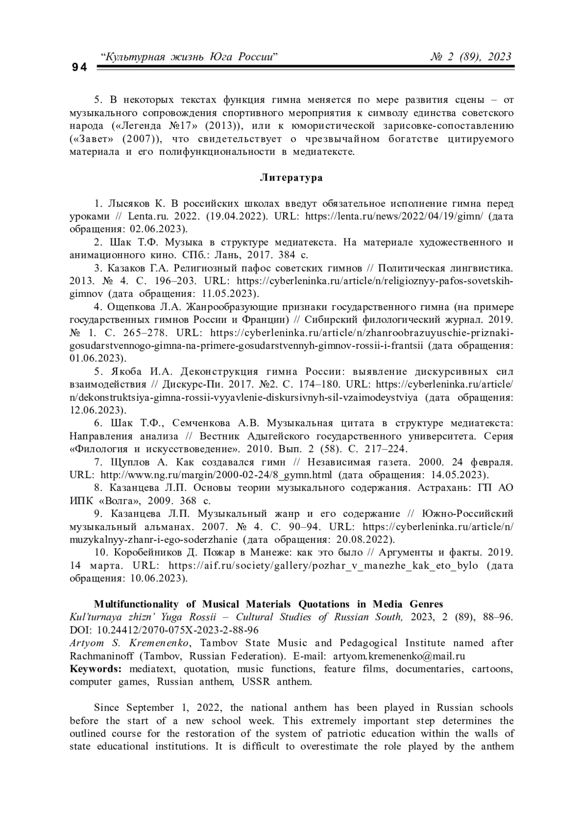 КРЕМЕНЕНКО А. С. ПОЛИФУНКЦИОНАЛЬНОСТЬ МУЗЫКАЛЬНОГО МАТЕРИАЛА ЦИТАТЫ В МЕДИАЖАНРАХ // КУЛЬТУРНАЯ ЖИЗНЬ ЮГА РОССИИ. 2023. № 2 (89)