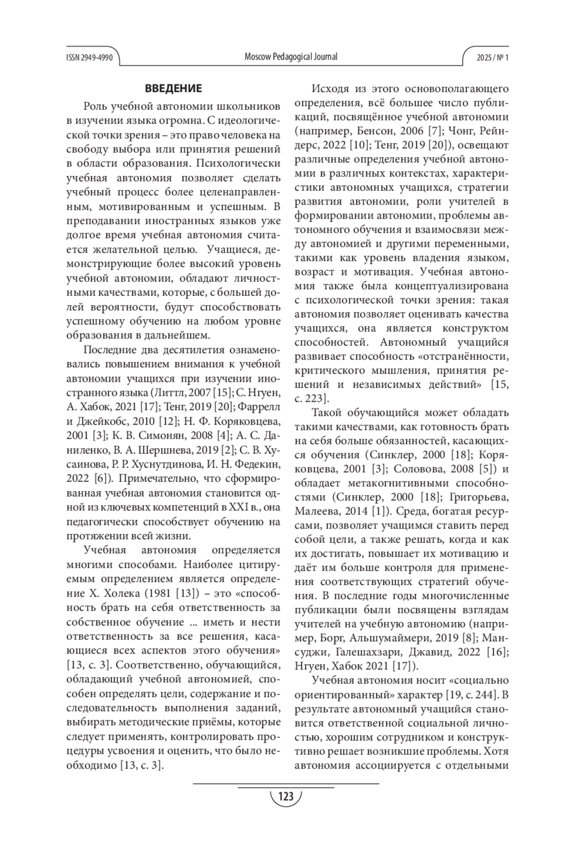 10. Chong S.W., Reinders H.Autonomy of English language learners: A scoping review of research and practice // Language Teaching Research.2022.№1-26.P.11-30. DOI: 10.1177/13621688221075812