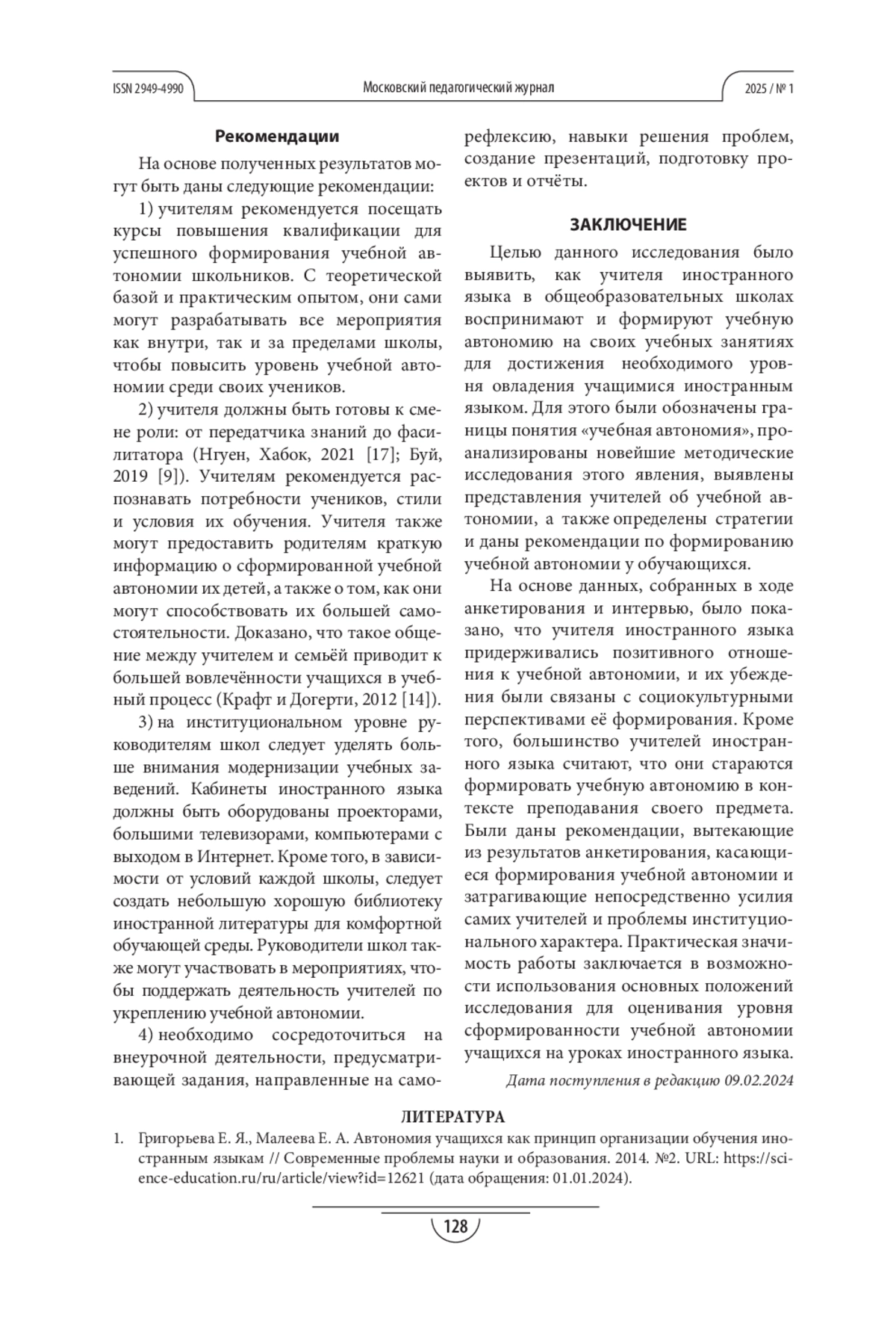 1. Григорьева Е.Я., Малеева Е.А.Автономия учащихся как принцип организации обучения иностранным языкам // Современные проблемы науки и образования.2014.№2.URL: https://science-education.ru/ru/article/view?id=12621 (дата обращения: 01.01.2024). EDN: SBWFKD