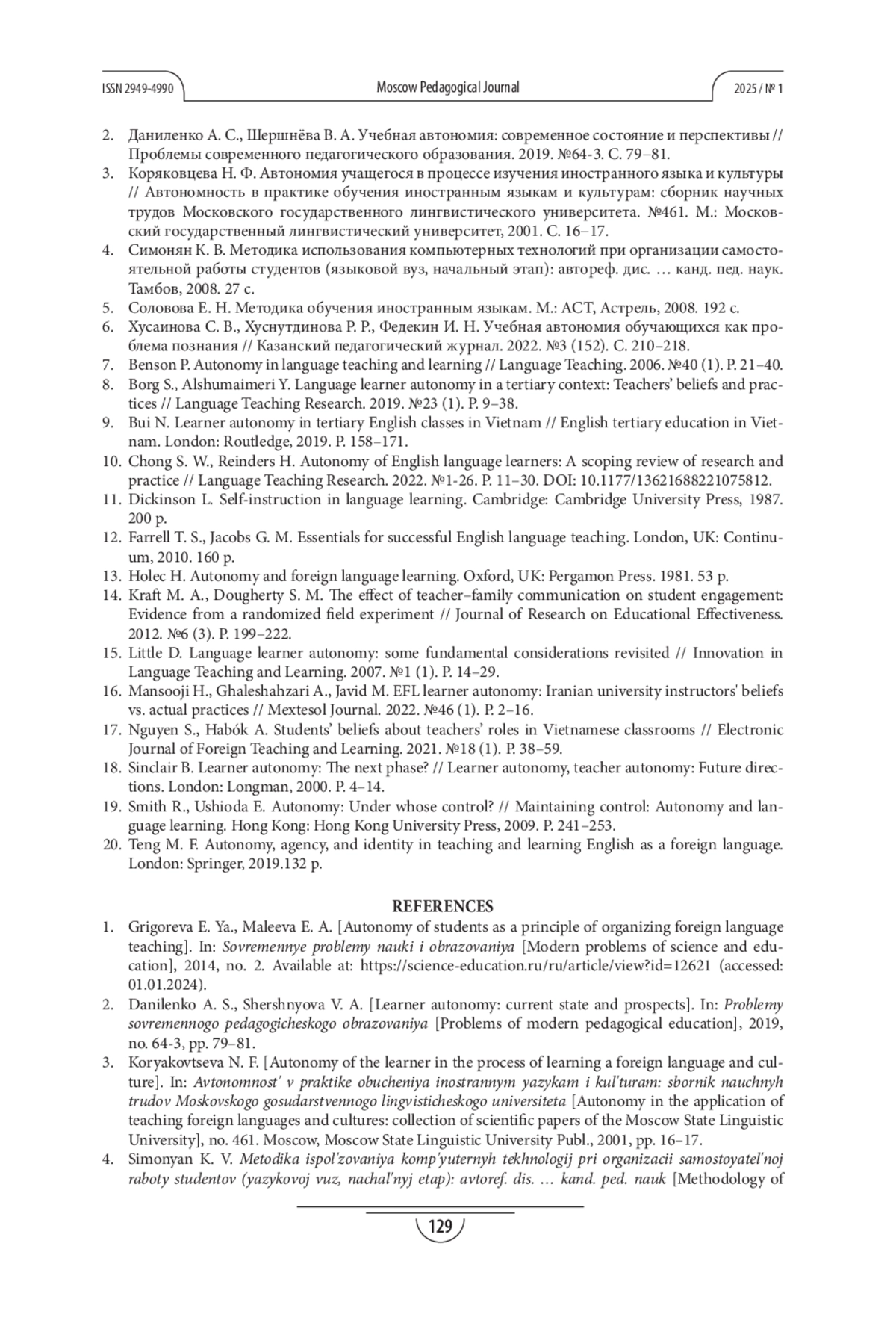 9. Bui N.Learner autonomy in tertiary English classes in Vietnam // English tertiary education in Vietnam.London: Routledge, 2019.Р.158-171.