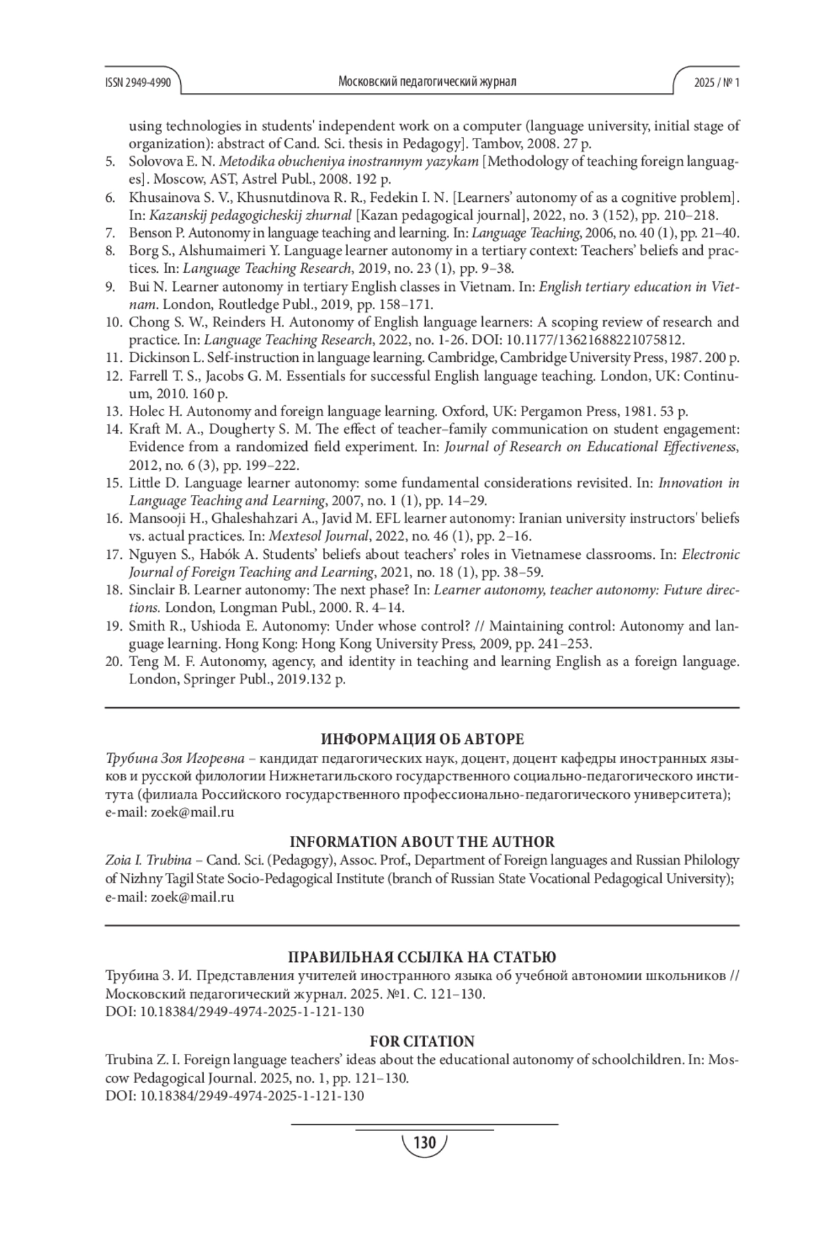 16. Mansooji H., Ghaleshahzari A., Javid M.EFL learner autonomy: Iranian university instructors’ beliefs vs.actual practices // Mextesol Journal.2022.№46 (1).Р.2-16.