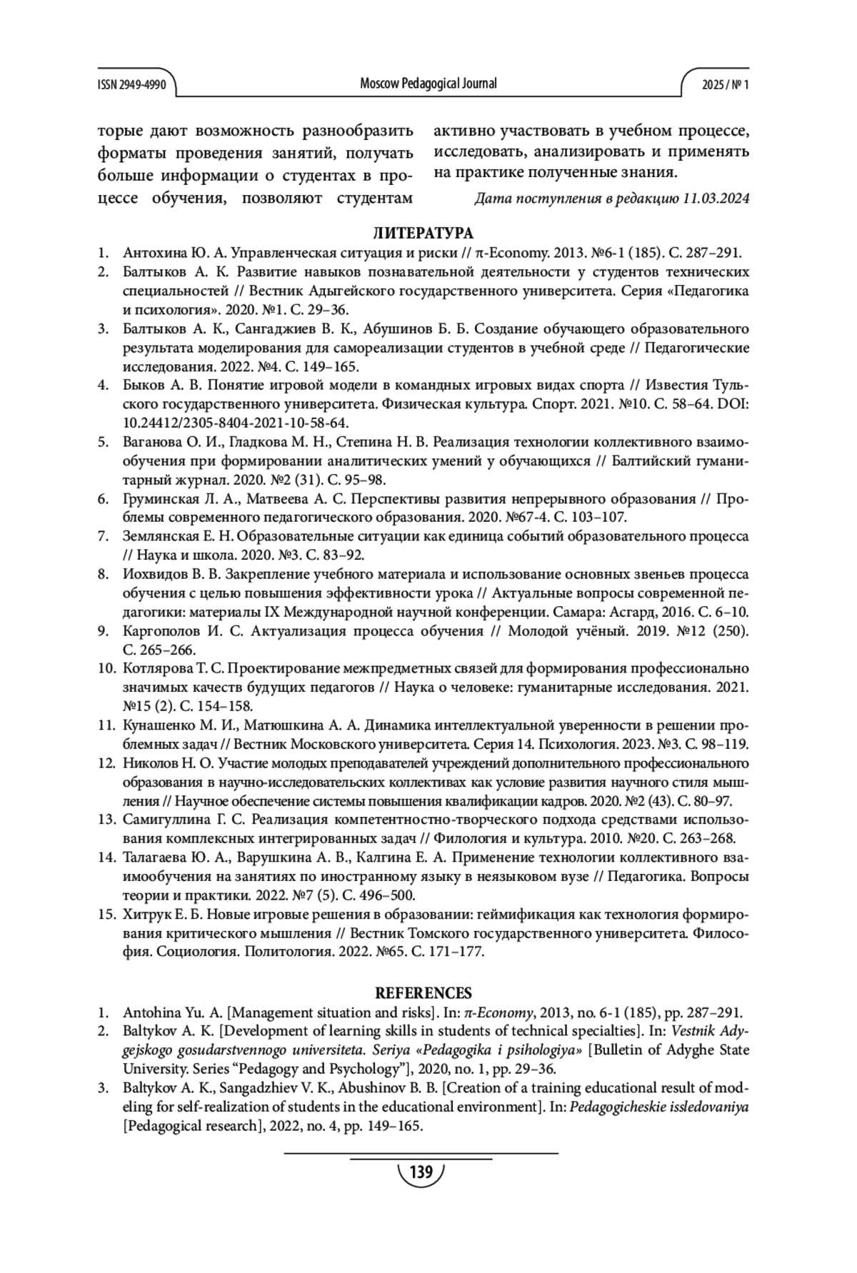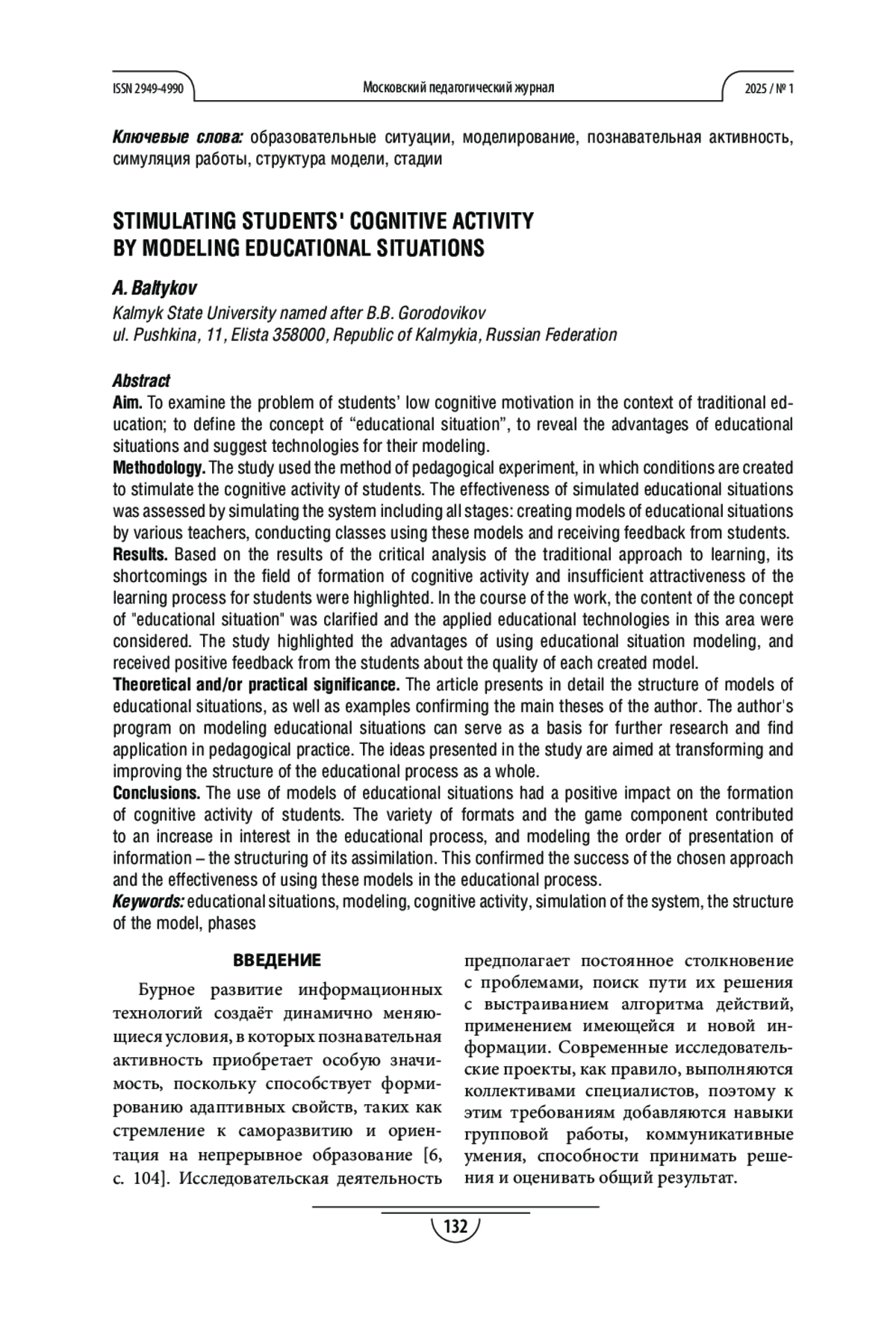 БАЛТЫКОВ А. К. СТИМУЛИРОВАНИЕ ПОЗНАВАТЕЛЬНОЙ АКТИВНОСТИ СТУДЕНТОВ ПУТЁМ МОДЕЛИРОВАНИЯ ОБРАЗОВАТЕЛЬНЫХ СИТУАЦИЙ // МОСКОВСКИЙ ПЕДАГОГИЧЕСКИЙ ЖУРНАЛ. 2025. № 1