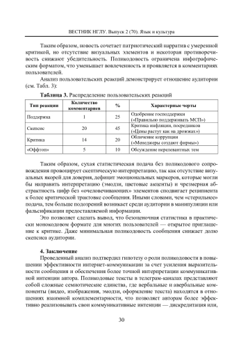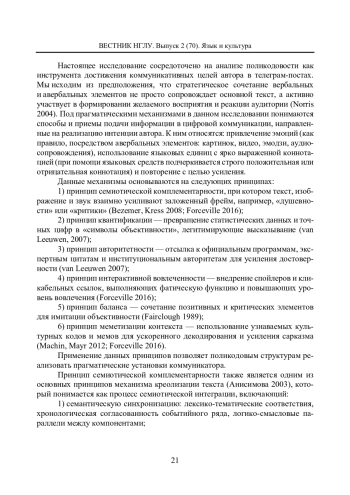 Статья посвящена исследованию роли поликодовости в эффективности коммуникации на примере новостных постов русскоязычных телеграм-каналов, что и является материалом исследования. В исследовании выявляется, как сочетание вербальных и авербальных элементов формирует семиотическое пространство, способствующее реализации коммуникативных интенций. Основное внимание уделяется прагматическим механизмам, направленным на реализацию интенции автора посредством фреймов. Методы включали лингвопрагматический анализ; когнитивно-дискурсивный метод, количественный контент-анализ. Результаты демонстрируют, что поликодовые структуры усиливают прагматическую нагрузку сообщения, активизируют когнитивные и эмоциональные реакции аудитории, способствуют заданной интерпретации и позволяют авторам выражать отношение к денотату - от дискредитации до одобрения. Визуальные элементы поликодового текста могут осуществлять коммуникативную функцию, при этом несбалансированное использование кодов (например, чрезмерная ирония) может снижать доверие к информации у аудитории. Исследование вносит вклад в понимание роли поликодовости в цифровых медиа, подчеркивая ее значение для мониторинга интерпретации информации и повышения вовлеченности аудитории, отмечается необходимость дальнейшего изучения стратегий формирования поликодового семиозиса в новых медиа.