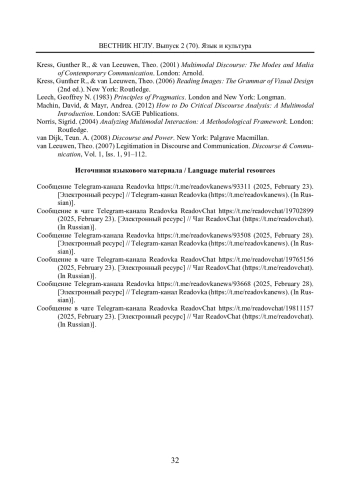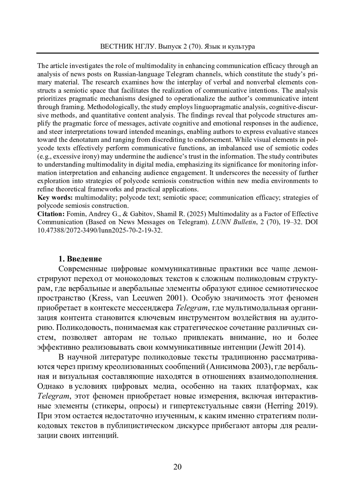 ГАБИТОВ Ш.Р., ФОМИН А.Г. ПОЛИКОДОВОСТЬ КАК ФАКТОР ЭФФЕКТИВНОСТИ КОММУНИКАЦИИ (НА МАТЕРИАЛЕ НОВОСТНЫХ ПОСТОВ В TELEGRAM) // ВЕСТНИК НИЖЕГОРОДСКОГО ГОСУДАРСТВЕННОГО ЛИНГВИСТИЧЕСКОГО УНИВЕРСИТЕТА ИМ. Н. А. ДОБРОЛЮБОВА. 2025. № 2 (70)