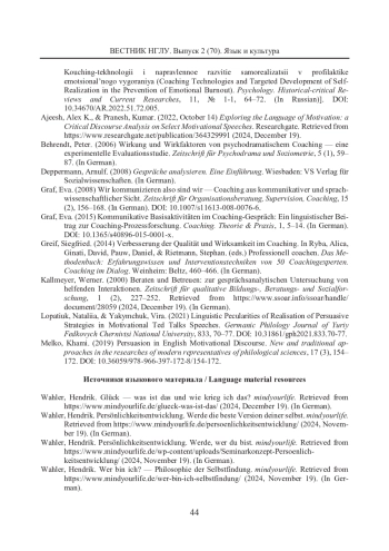 5. Гаевская М. А., Мошняга Е. В., Чихачева Д. В. Аксиологическая прагматика мотивационного дискурса на материале речей американских коучей // Вестник Челябинского государственного университета. 2024. № 1 (483). С. 81-91.