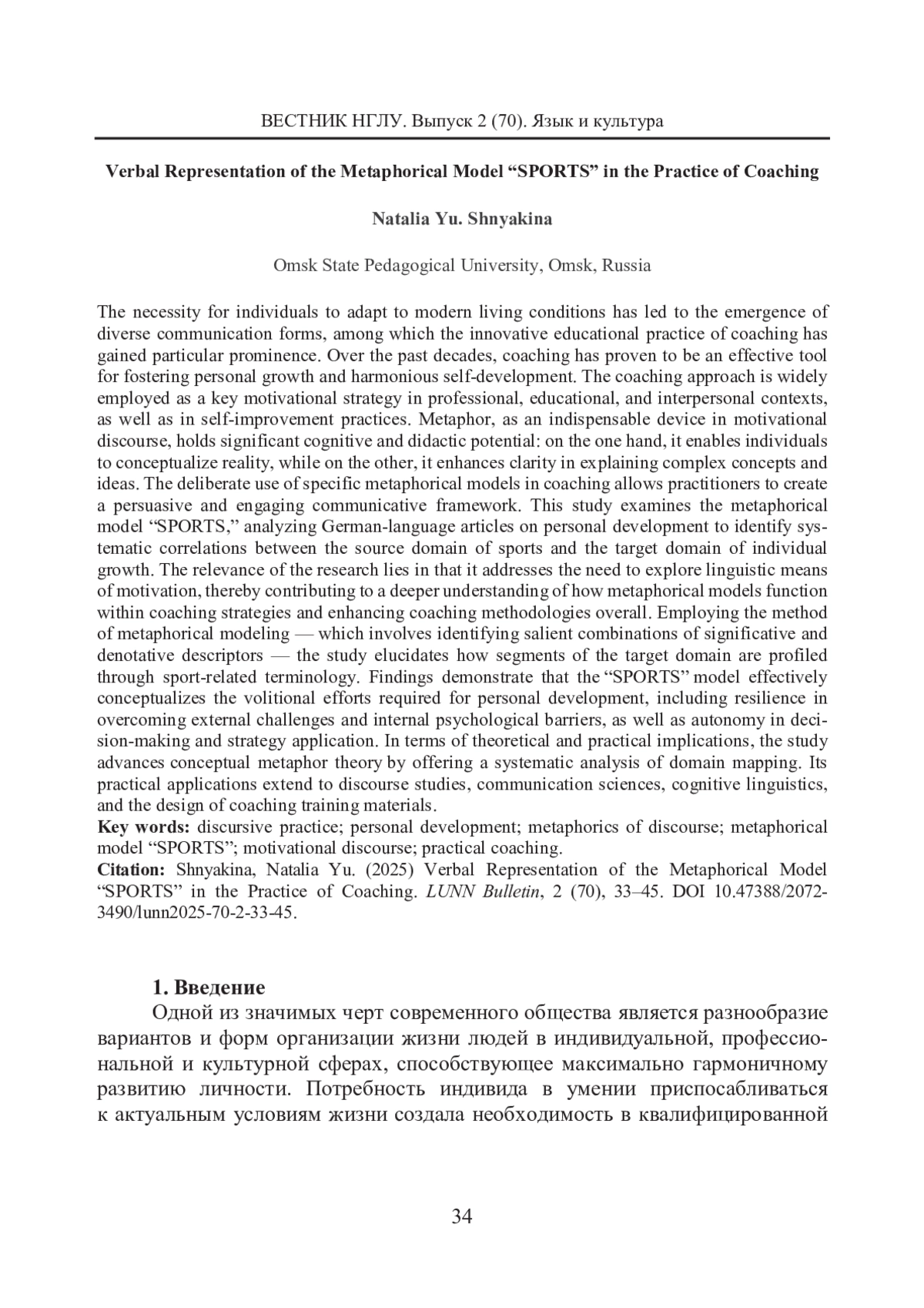 Необходимость адаптации человека к современным условиям жизни способствует появлению множества форм общения; особую популярность в этой связи приобрела инновационная образовательная практика коучинга, зарекомендовавшая себя за последние десятилетия как эффективное средство развития гармоничной личности. Коучинговый подход применяется в качестве основного способа мотивации в профессиональной и образовательной сферах, а также в области межличностного взаимодействия и самосовершенствования. Метафора, будучи незаменимым средством в построении мотивационных текстов, обладает значительным когнитивным и дидактическим потенциалом: с одной стороны, благодаря метафоре человек познает действительность, с другой - данный механизм обеспечивает наглядность в объяснении сложных понятий и идей. Использование в практическом коучинге определенных метафорических моделей позволяет коучу создать благоприятный фон, обеспечивающий убедительность сказанного. Настоящая работа посвящена метафорической модели «СПОРТ»: на материале немецкоязычных статей, представляющих собой рекомендации по личностному развитию, определяются системные корреляции между исходной сферой спорта и сферой индивидуального роста человека. Потребность в выявлении языковых способов мотивации обусловила актуальность исследования, позволяющего расширить знания об эффективности используемых коучами метафорических моделей в рамках различных коммуникативных стратегий, что способствует усовершенствованию практики коучинга в целом. Посредством метода метафорического моделирования, предполагающего определение наиболее значимых комбинаций сигнификативных и денотативных дескрипторов, описывается специфика профилирования отдельных участков результирующей области в терминах спорта. Исследование показало, что модель «СПОРТ» позволяет осмыслить прилагаемые человеком в процессе личностного развития волевые усилия и умение противостоять внешним обстоятельствам и внутренним психологическим препятствиям, а также осознать самостоятельность в принятии индивидом решений и используемые им стратегии. Работа обладает теоретической значимостью, поскольку вносит вклад в развитие теории концептуальной метафоры; практическая ценность статьи заключается в возможности использования ее положений в курсах по дискурсологии, коммуникативистике, когнитивной лингвистике, а также при создании пособий по практическому коучингу.