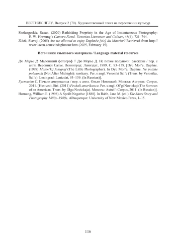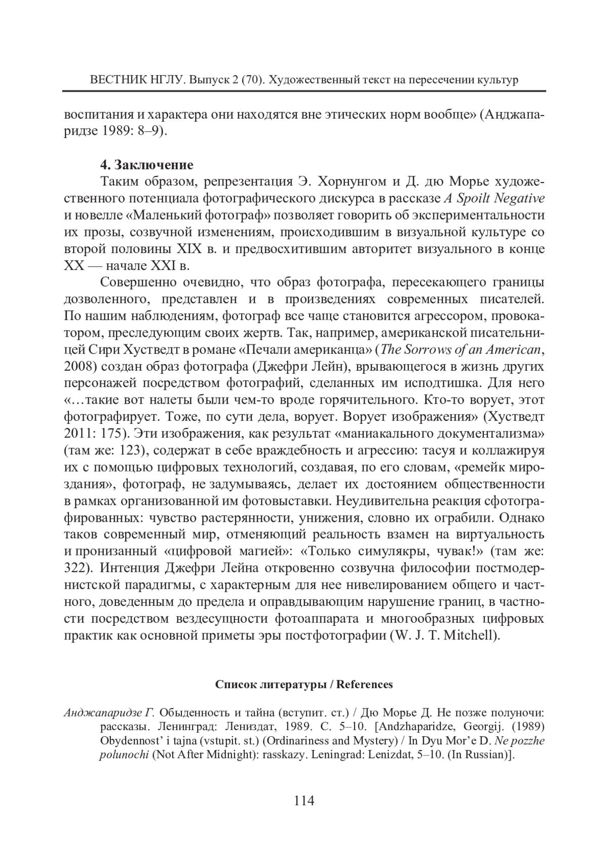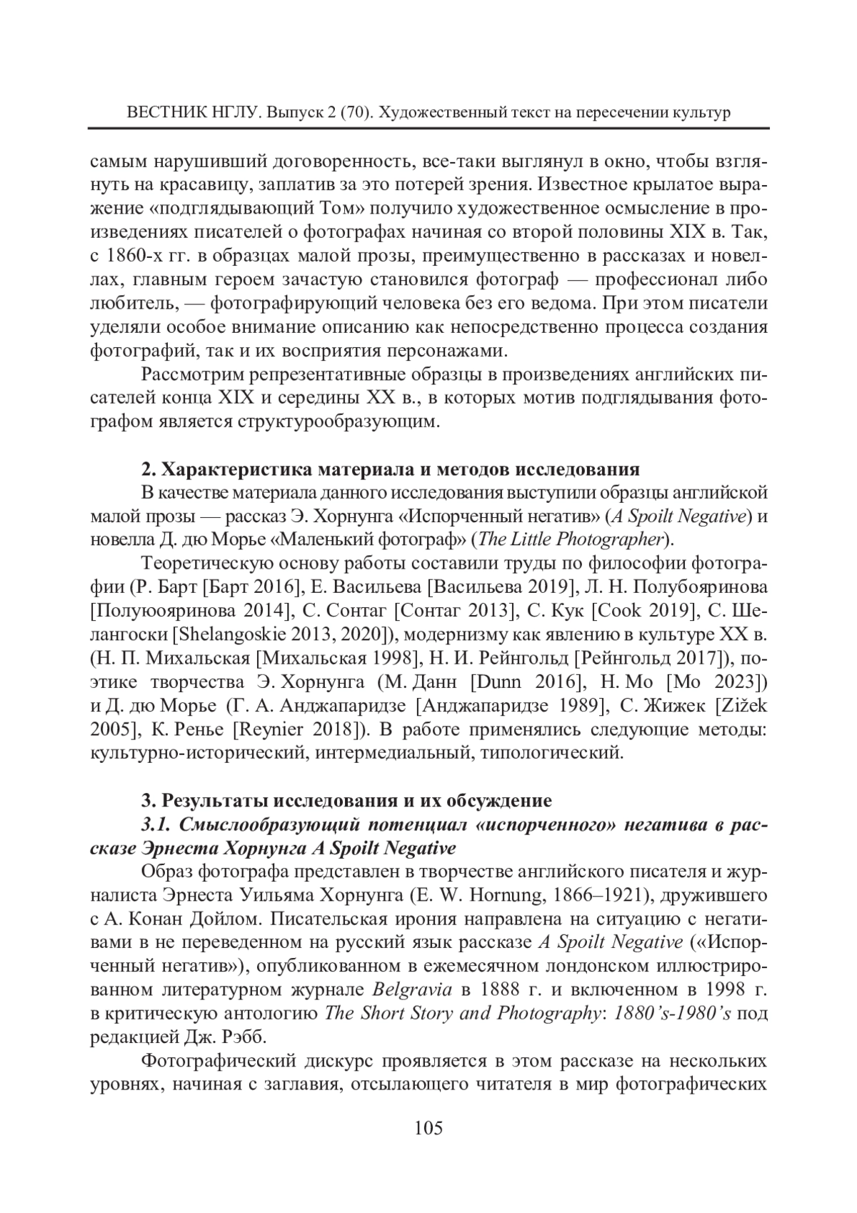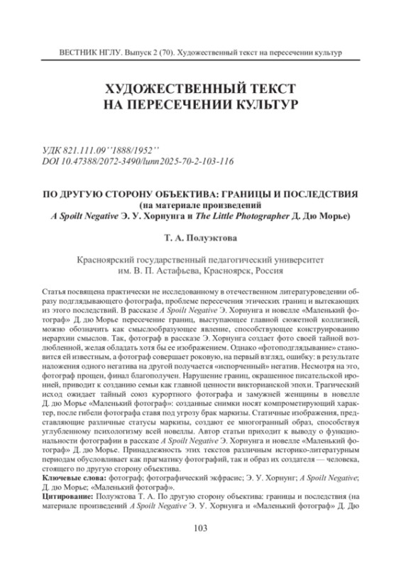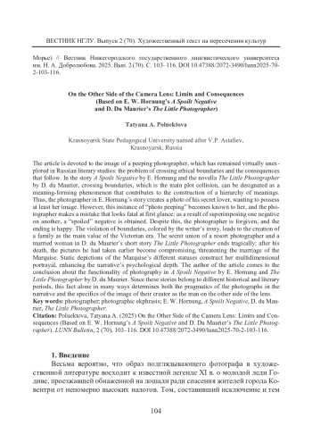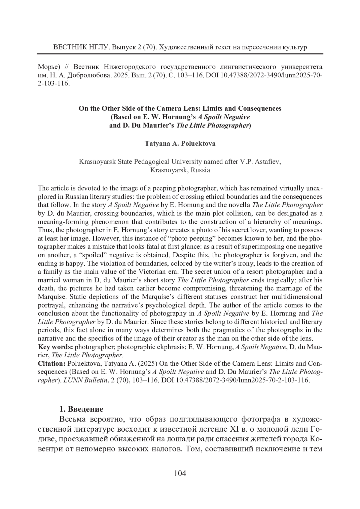 ПОЛУЭКТОВА Т. А. ПО ДРУГУЮ СТОРОНУ ОБЪЕКТИВА: ГРАНИЦЫ И ПОСЛЕДСТВИЯ (НА МАТЕРИАЛЕ ПРОИЗВЕДЕНИЙ A SPOILT NEGATIVE Э. У. ХОРНУНГА И THE LITTLE PHOTOGRAPHER Д. ДЮ МОРЬЕ) // ВЕСТНИК НИЖЕГОРОДСКОГО ГОСУДАРСТВЕННОГО ЛИНГВИСТИЧЕСКОГО УНИВЕРСИТЕТА ИМ. Н. А. ДОБРОЛЮБОВА. 2025. № 2 (70)