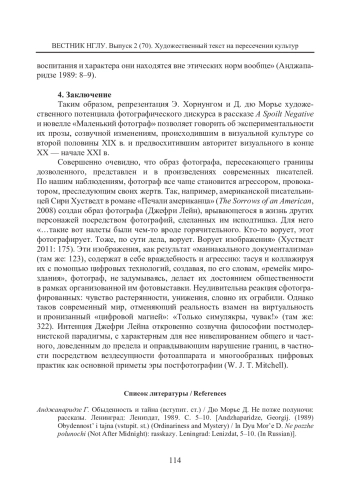 Статья посвящена практически не исследованному в отечественном литературоведении образу подглядывающего фотографа, проблеме пересечения этических границ и вытекающих из этого последствий. В рассказе A Spoilt Negative Э. Хорнунга и новелле «Маленький фотограф» Д. дю Морье пересечение границ, выступающее главной сюжетной коллизией, можно обозначить как смыслообразующее явление, способствующее конструированию иерархии смыслов. Так, фотограф в рассказе Э. Хорнунга создает фото своей тайной возлюбленной, желая обладать хотя бы ее изображением. Однако «фотоподглядывание» становится ей известным, а фотограф совершает роковую, на первый взгляд, ошибку: в результате наложения одного негатива на другой получается «испорченный» негатив. Несмотря на это, фотограф прощен, финал благополучен. Нарушение границ, окрашенное писательской иронией, приводит к созданию семьи как главной ценности викторианской эпохи. Трагический исход ожидает тайный союз курортного фотографа и замужней женщины в новелле Д. дю Морье «Маленький фотограф»: созданные снимки носят компрометирующий характер, после гибели фотографа ставя под угрозу брак маркизы. Статичные изображения, представляющие различные статусы маркизы, создают ее многогранный образ, способствуя углубленному психологизму всей новеллы. Автор статьи приходит к выводу о функциональности фотографии в рассказе A Spoilt Negative Э. Хорнунга и новелле «Маленький фотограф» Д. дю Морье. Принадлежность этих текстов различным историко-литературным периодам обусловливает как прагматику фотографий, так и образ их создателя - человека, стоящего по другую сторону объектива.