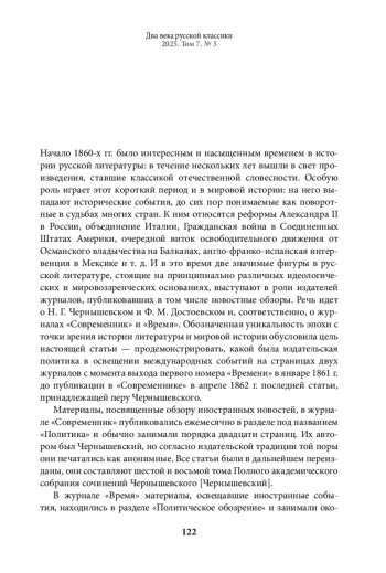 В центре внимания автора статьи находятся особенности редакционной политики журналов «Время» и «Современник» в репрезентации международных событий с января 1861 по апрель 1862 г. — периода, на протяжении которого одновременно выходили номера этих двух изданий. Стратегии журналов близки при освещении событий итальянского Рисорджименто, интервенции в Мексику, в понимании положения Венгрии в составе Австрии и др. Важнейшее отличие связано с репрезентацией гражданской войны в США, принципиально отличаются подходы журналов к вопросам внутренней политики Османской империи. В статье продемонстрировано, что появление статьи Достоевского «Славянофилы, черногорцы и западники…» во многом обусловлено публикациями Чернышевского в разделе «Политика» за 1861 г. и их спецификой в понимании славянского вопроса и событий в США.