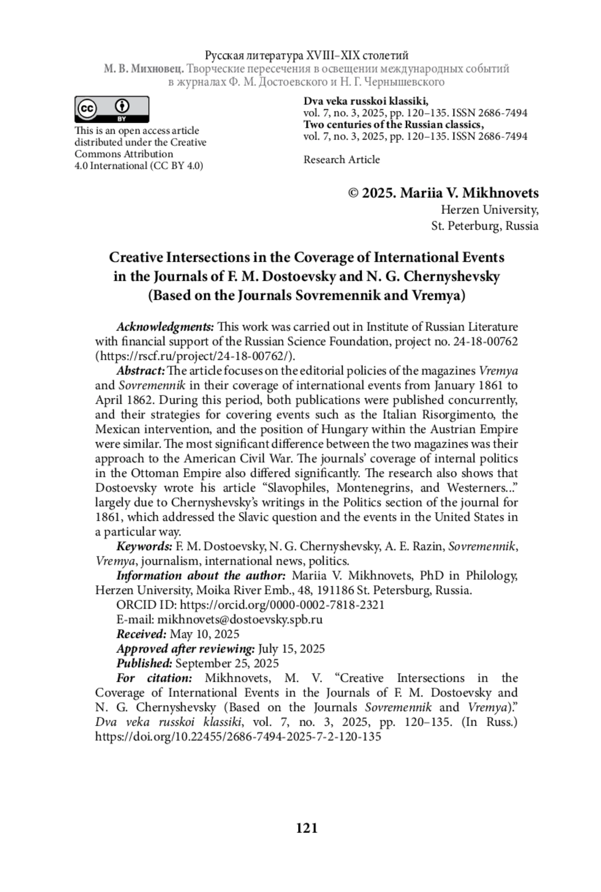 8. Михновец М. В. Вопрос о судьбах балканских народов в публицистическом диалоге Н. Г. Чернышевского и Ф. М. Достоевского // Русская литература. 2025. № 1. С. 68-76. DOI: 10.31860/0131-6095-2025-1-68-76 EDN: KFAQXT