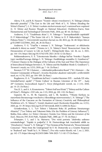 10. Гапуров Ш. А., Гапурова М. Ш., Саралиева Л. Ш. Влияние Кавказа на становление литературного творчества и философского мировоззрения Л. Н. Толстого // Вестник Академии наук Чеченской Республики. 2020. № 4 (51). С. 33-39. DOI: 10.25744/vestnik.2020.51.4.006 EDN: ZSYBFL