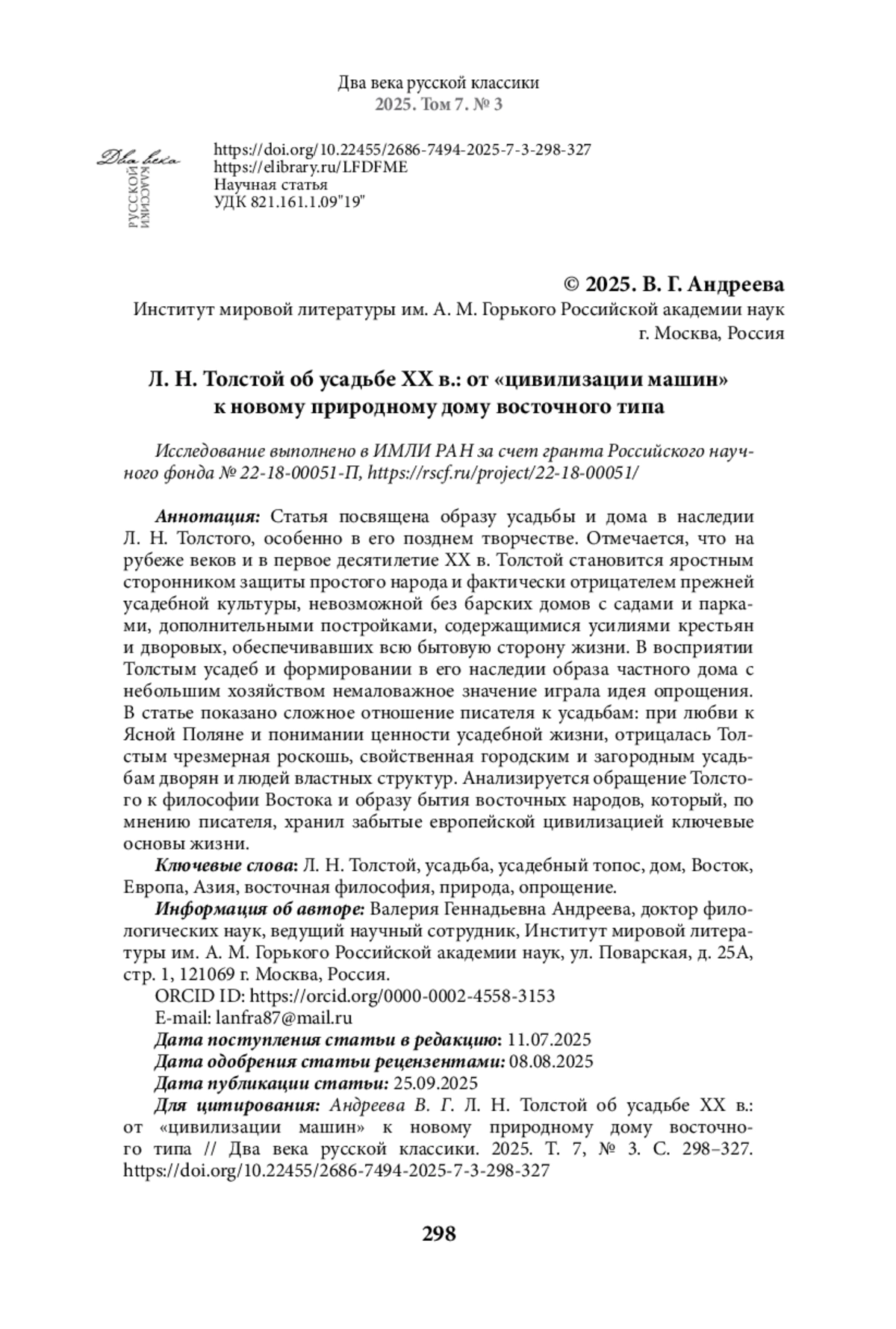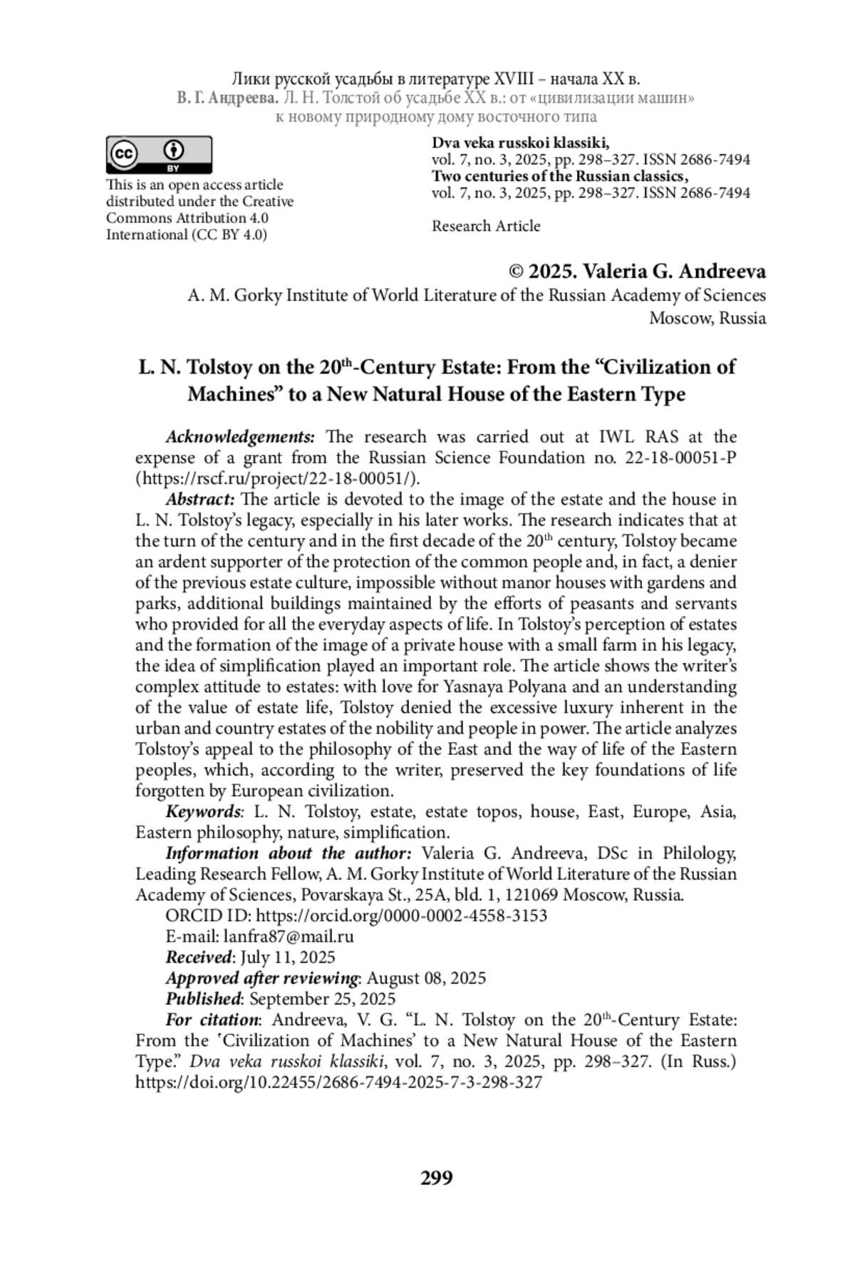 4. Андреева В. Г. Усадебная жизнь Л. Н. Толстого в “Яснополянских записках” Д. П. Маковицкого // Университетский научный журнал. 2022. № 68. С. 36-48. DOI: 10.25807/22225064_2022_68_36