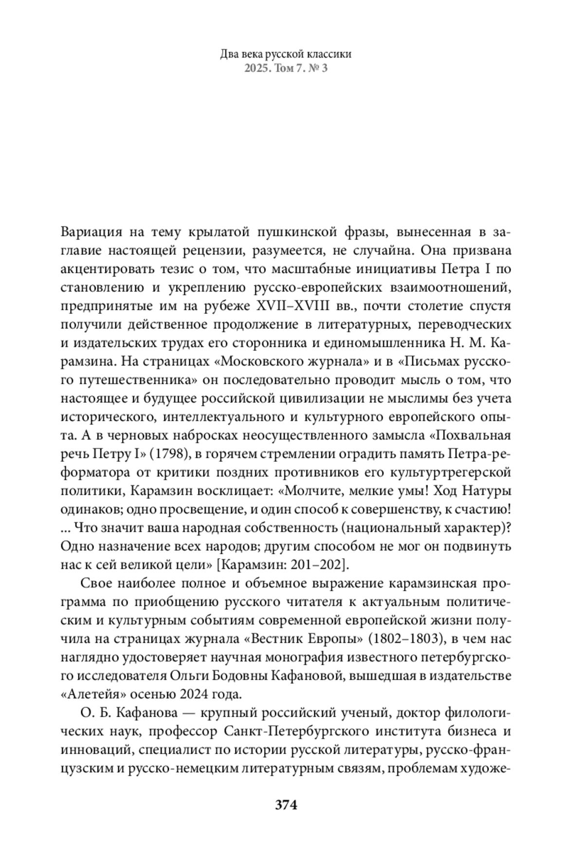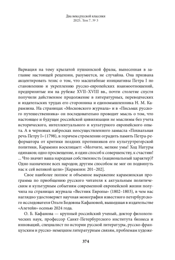 Вариация на тему крылатой пушкинской фразы, вынесенная в заглавие настоящей рецензии, разумеется, не случайна. Она призвана акцентировать тезис о том, что масштабные инициативы Петра I по становлению и укреплению русско-европейских взаимоотношений, предпринятые им на рубеже XVII–XVIII вв., почти столетие спустя получили действенное продолжение в литературных, переводческих и издательских трудах его сторонника и единомышленника Н. М. Карамзина. На страницах «Московского журнала» и в «Письмах русского путешественника» он последовательно проводит мысль о том, что настоящее и будущее российской цивилизации не мыслимы без учета исторического, интеллектуального и культурного европейского опыта. А в черновых набросках неосуществленного замысла «Похвальная речь Петру I» (1798), в горячем стремлении оградить память Петра-реформатора от критики поздних противников его культуртрегерской политики, Карамзин восклицает: «Молчите, мелкие умы! Ход Натуры одинаков; одно просвещение, и один способ к совершенству, к счастию!… Что значит ваша народная собственность (национальный характер)? Одно назначение всех народов; другим способом не мог он подвинуть нас к сей великой цели» [Карамзин: 201–202].