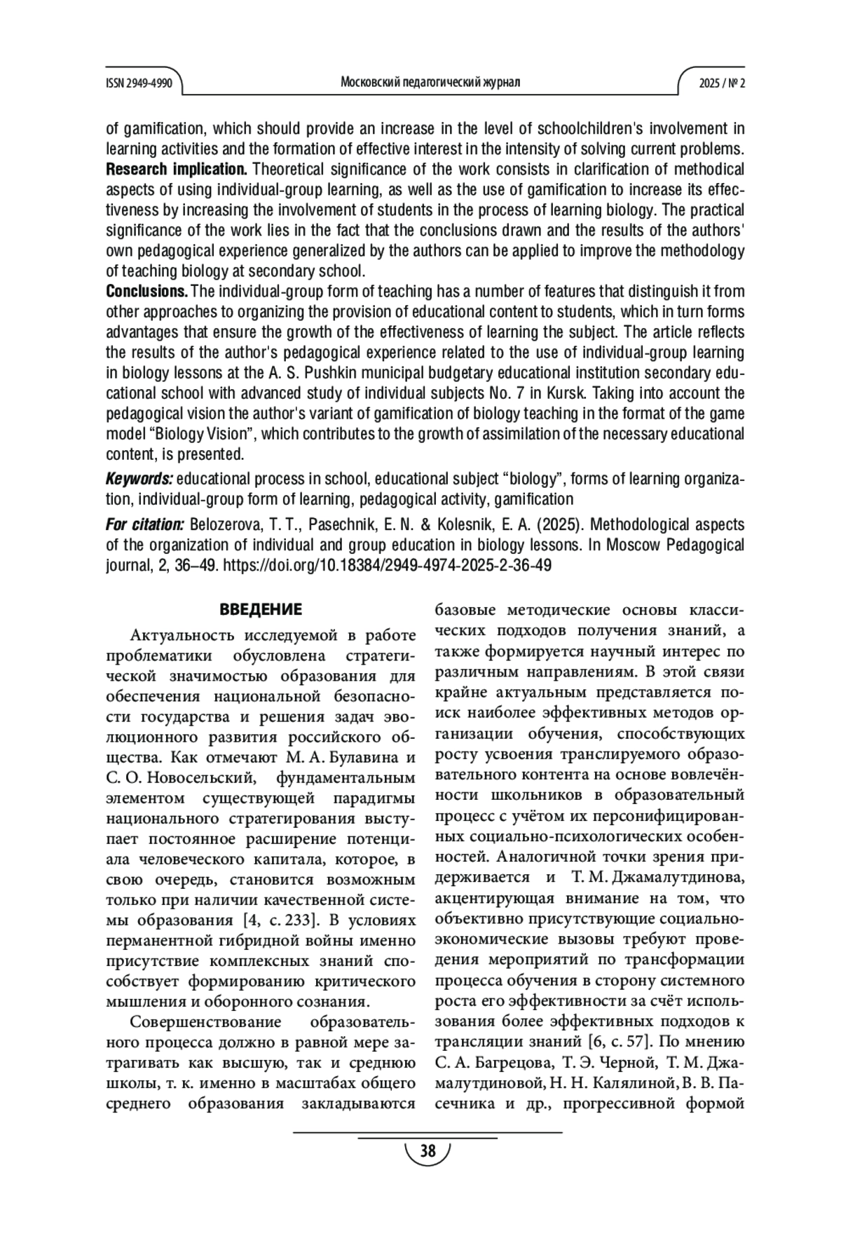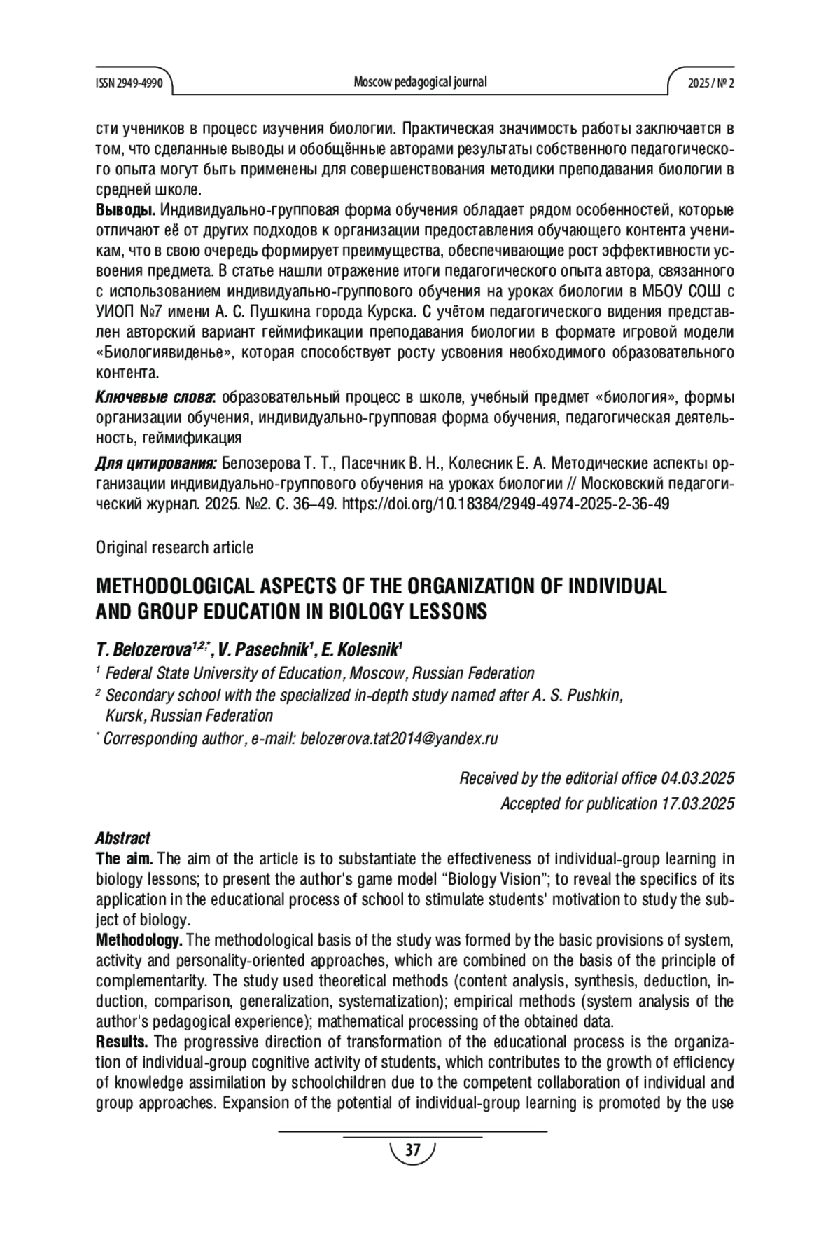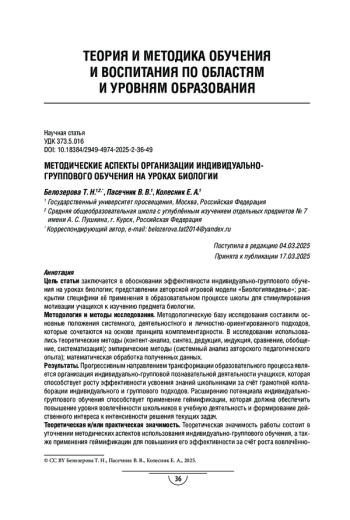 Выводы. Индивидуально-групповая форма обучения обладает рядом особенностей, которые отличают её от других подходов к организации предоставления обучающего контента ученикам, что в свою очередь формирует преимущества, обеспечивающие рост эффективности усвоения предмета. В статье нашли отражение итоги педагогического опыта автора, связанного с использованием индивидуально-группового обучения на уроках биологии в МБОУ СОШ с УИОП №7 имени А. С. Пушкина города Курска. С учётом педагогического видения представлен авторский вариант геймификации преподавания биологии в формате игровой модели «Биологиявиденье», которая способствует росту усвоения необходимого образовательного контента.