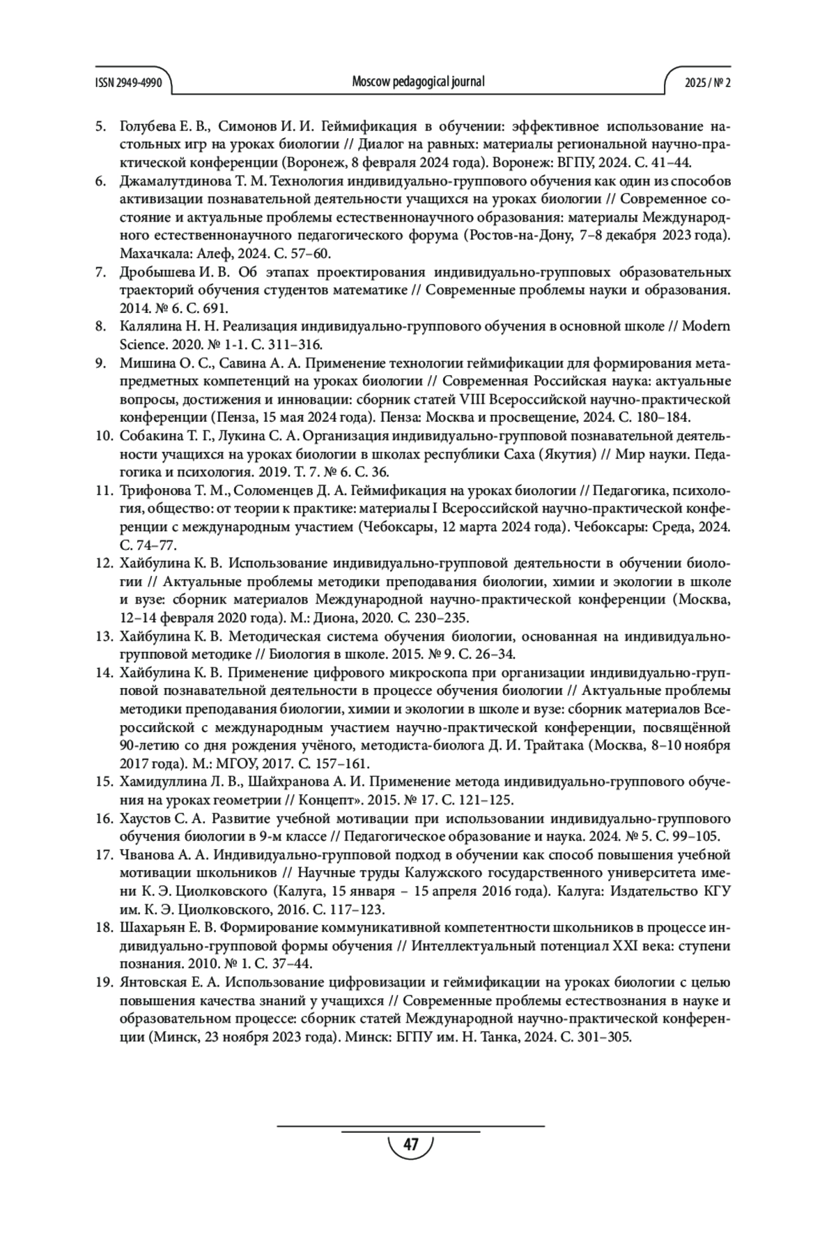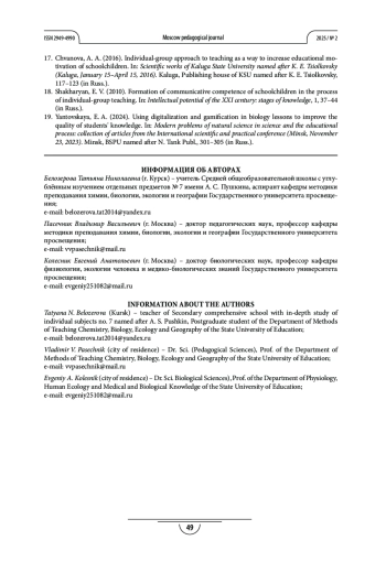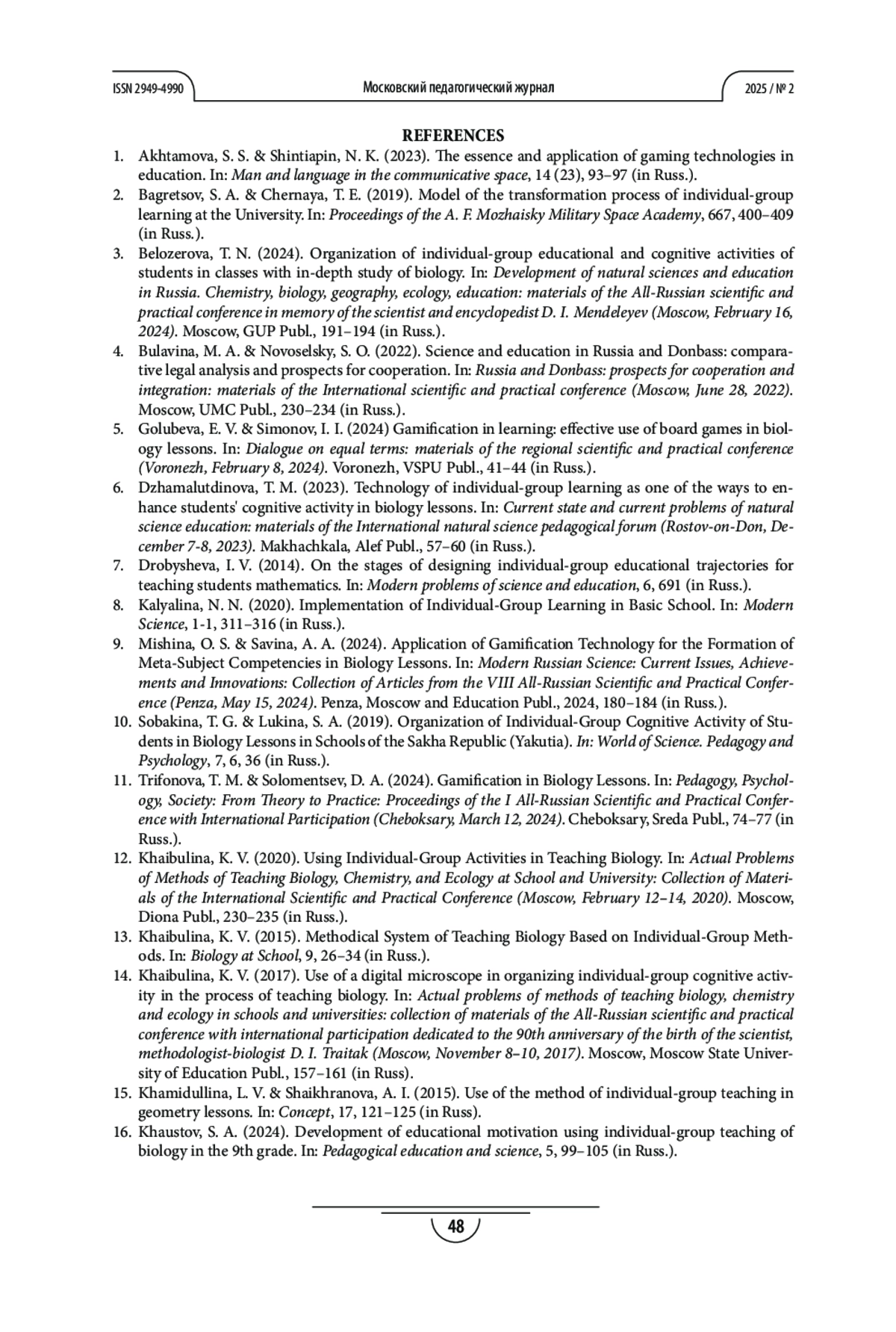 16. Хаустов С. А. Развитие учебной мотивации при использовании индивидуально-группового обучения биологии в 9-м классе // Педагогическое образование и наука. 2024. № 5. С. 99-105. EDN: BAPQAN