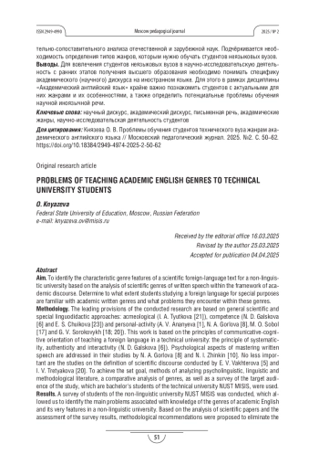 Выводы. Для вовлечения студентов неязыковых вузов в научно-исследовательскую деятельность с ранних этапов получения высшего образования необходимо понимать специфику академического (научного) дискурса на иностранном языке. Для этого в рамках дисциплины «Академический английский язык» крайне важно познакомить студентов с актуальными для них жанрами и их особенностями, а также определить потенциальные проблемы обучения научной иноязычной речи.