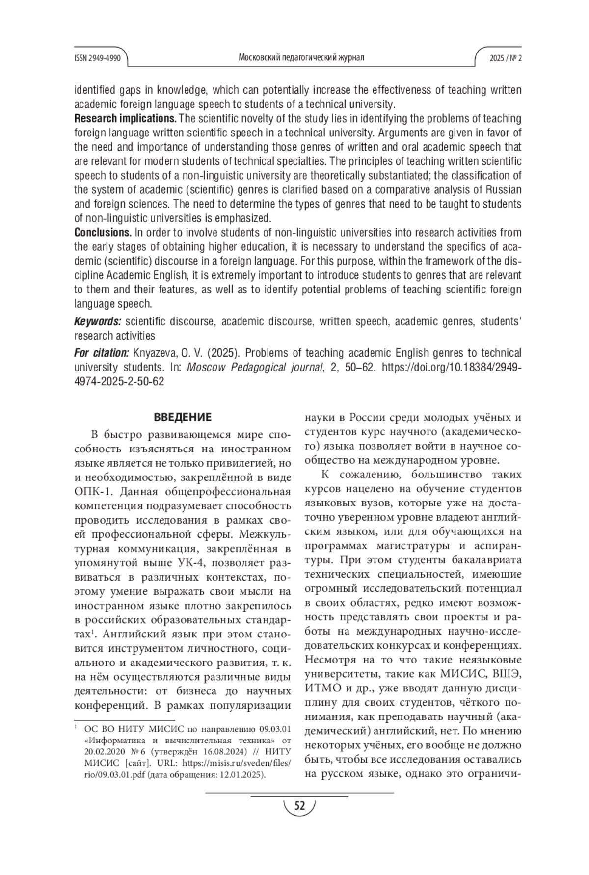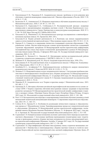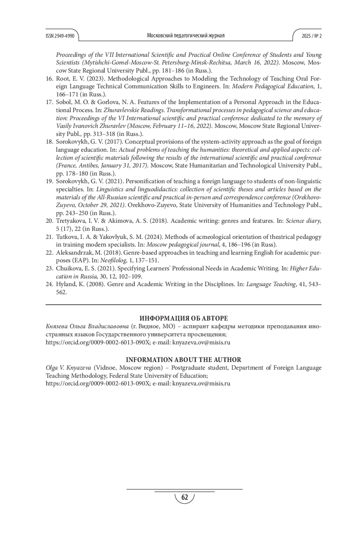 23. Chuikova E. S. Specifying Learners’ Professional Needs in Academic Writing (Определение профессиональных потребностей учащихся в академическом письме) // Higher Education in Russia. 2021. Vol. 30. № 12. P. 102-109.