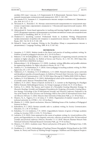 1. Ананьина А. В. Современные тенденции теории и практики обучения академическому письму // Проблемы современного педагогического образования. 2023. №81-2. С. 59-63. EDN: DFRVCY