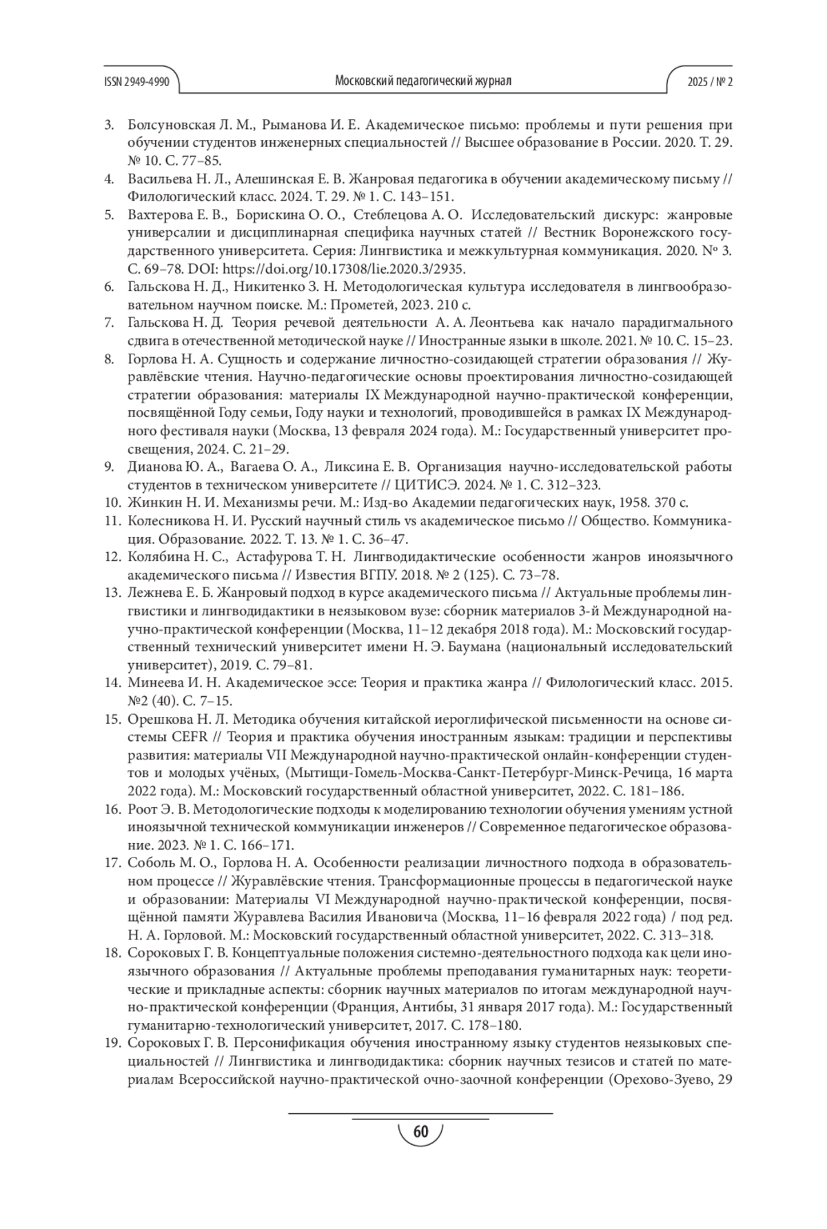 3. Болсуновская Л. М., Рыманова И. Е. Академическое письмо: проблемы и пути решения при обучении студентов инженерных специальностей // Высшее образование в России. 2020. Т. 29. № 10. C. 77-85. EDN: WINNEC