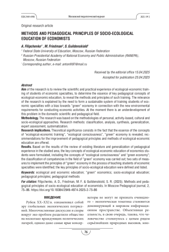 Теоретическая и/или практическая значимость. Теоретическое значение состоит в том, что раскрыта сущность понятий «эколого-экономическая подготовка», «экологическое сознание», «зелёная» экономика; предложены рекомендации по совершенствованию педагогических принципов и методов эколого-экономического образования. Результаты исследования. По итогам обзора существующей литературы и обобщения педагогического опыта в исследуемой области были сформулированы ключевые понятия эколого-экономического образования студентов-экономистов, в том числе понятия «экологического сознания» и «зелёной экономики»; проведена классификация компетенций в области «зелёной» экономики; выделены два комплекса мер по внедрению принципов «зелёной» экономики в процесс обучения студентов экономических специальностей; определены и перечислены ключевые принципы социально-экологического образования.