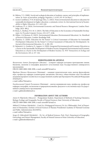 17. Acosta Castellanos P. M., Queiruga-Dios A. From environmental education to education for sustainable development in higher education: a systematic review (От экологического образования к образованию для устойчивого развития в высшем образовании: систематический обзор) // International Journal of Sustainability in Higher Education. 2022. Т. 23. № 3. С. 622-644.
