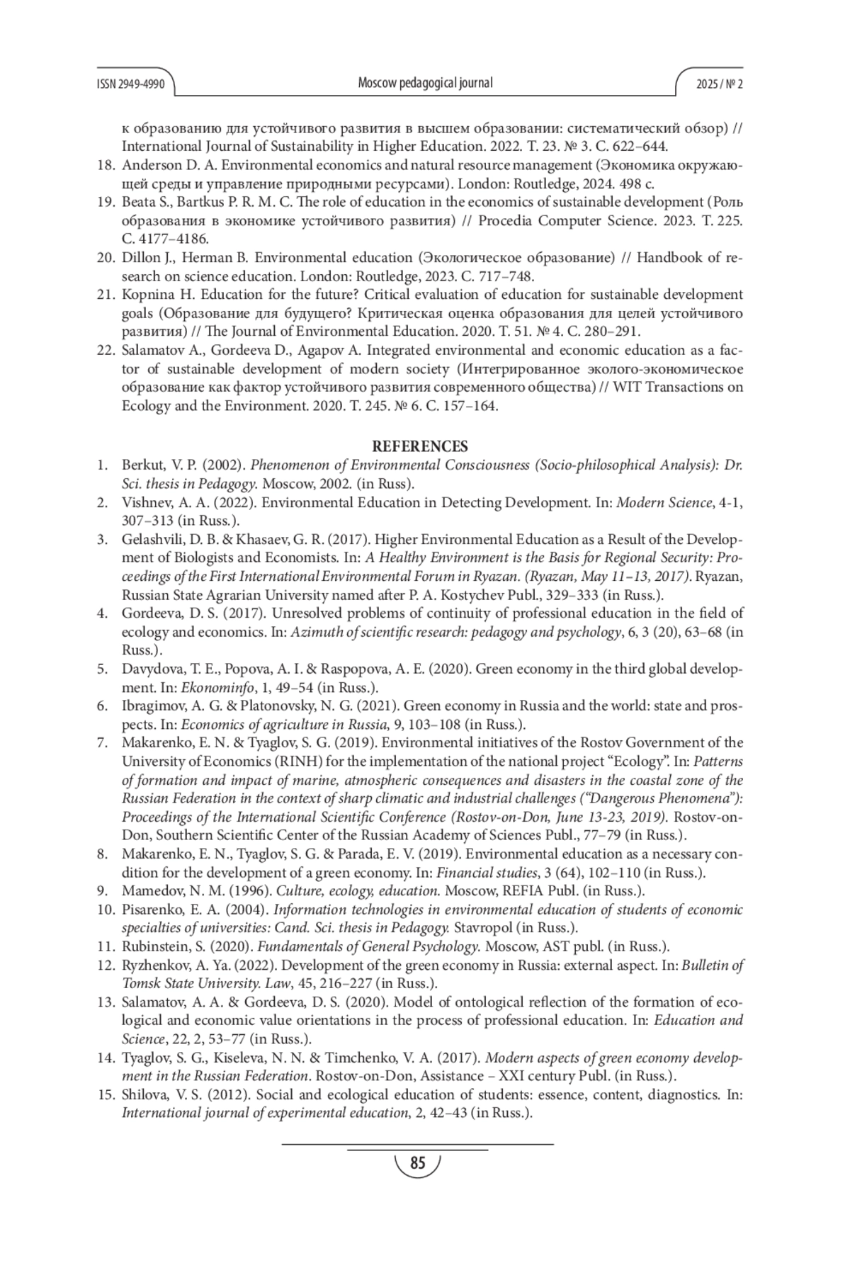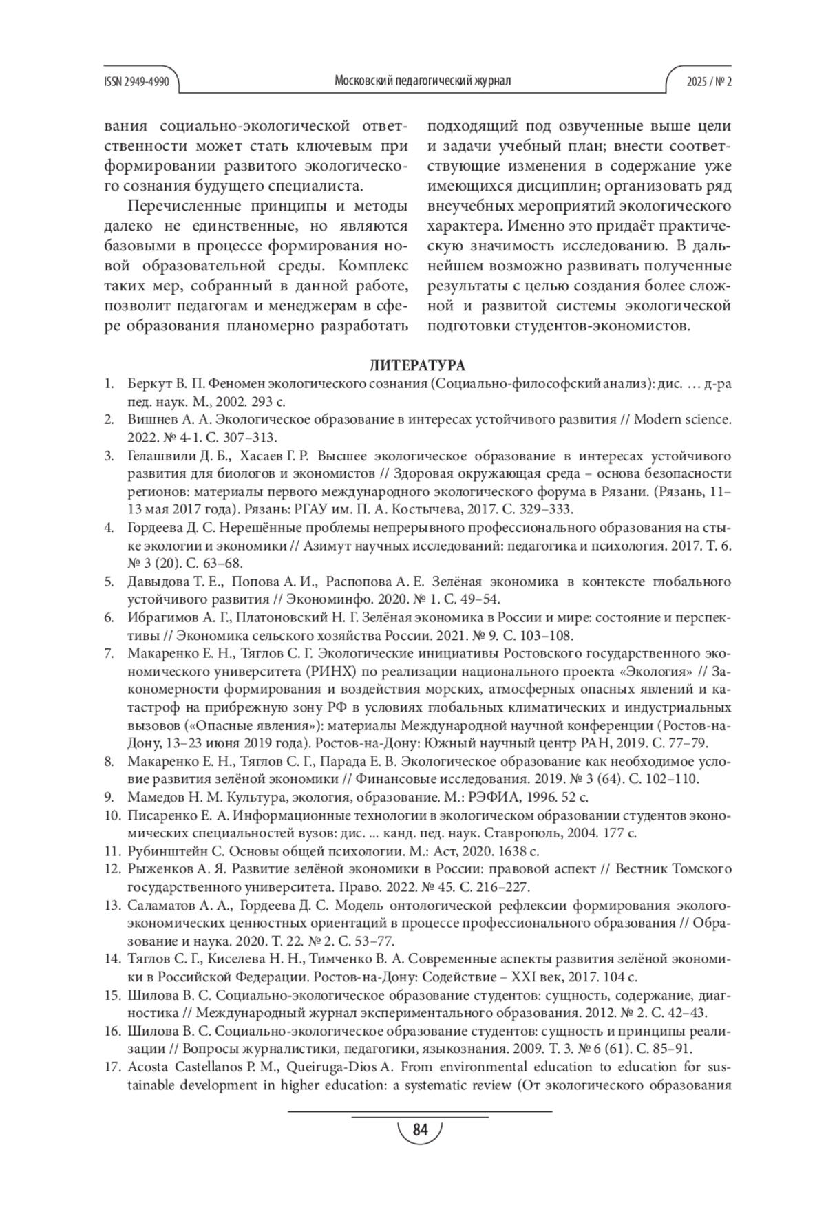4. Гордеева Д. С. Нерешённые проблемы непрерывного профессионального образования на стыке экологии и экономики // Азимут научных исследований: педагогика и психология. 2017. Т. 6. № 3 (20). С. 63-68. EDN: ZISRHT