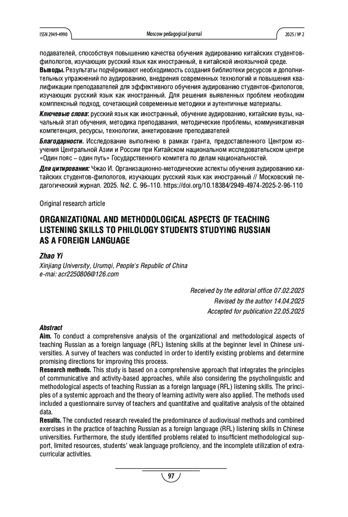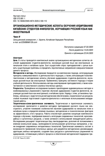 Цель. В статье проводится комплексный анализ организационно-методических аспектов обучения аудированию студентов-филологов, изучающих русский язык как иностранный, на начальном этапе в китайских вузах. Был осуществлён опрос преподавателей с целью выявить существующие проблемы и определить перспективные направления совершенствования данного процесса.