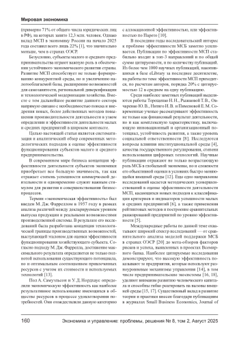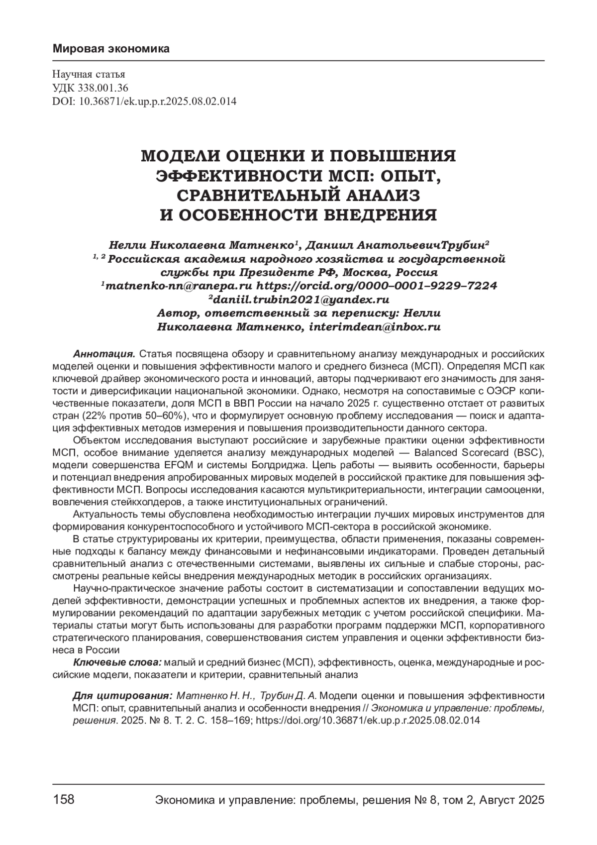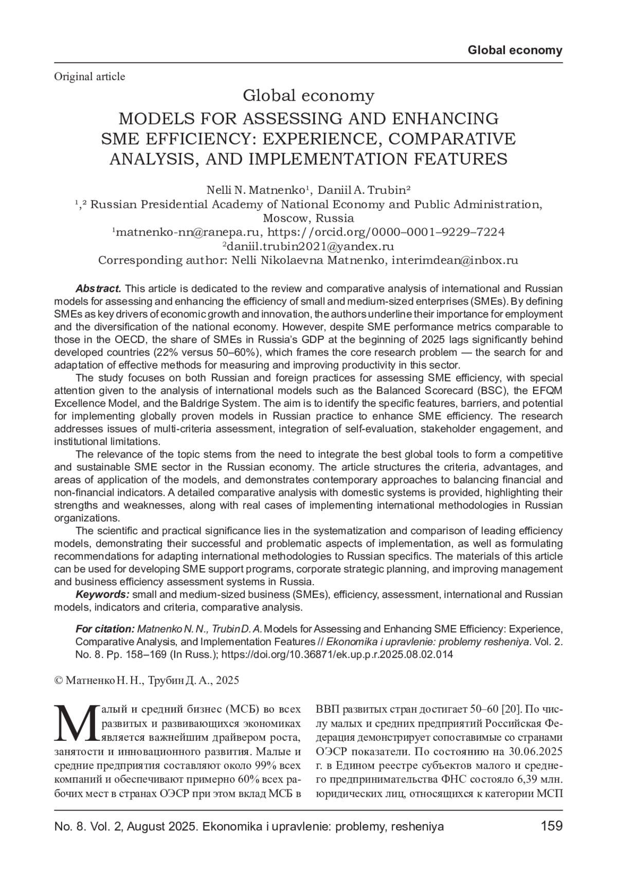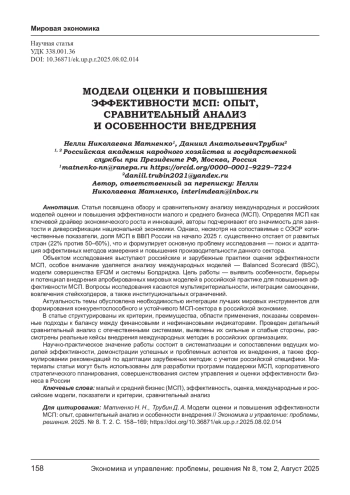 ТРУБИН Д. А., МАТНЕНКО Н. Н. МОДЕЛИ ОЦЕНКИ И ПОВЫШЕНИЯ ЭФФЕКТИВНОСТИ МСП: ОПЫТ, СРАВНИТЕЛЬНЫЙ АНАЛИЗ И ОСОБЕННОСТИ ВНЕДРЕНИЯ // ЭКОНОМИКА И УПРАВЛЕНИЕ: ПРОБЛЕМЫ, РЕШЕНИЯ. 2025. ТОМ 2 № 8