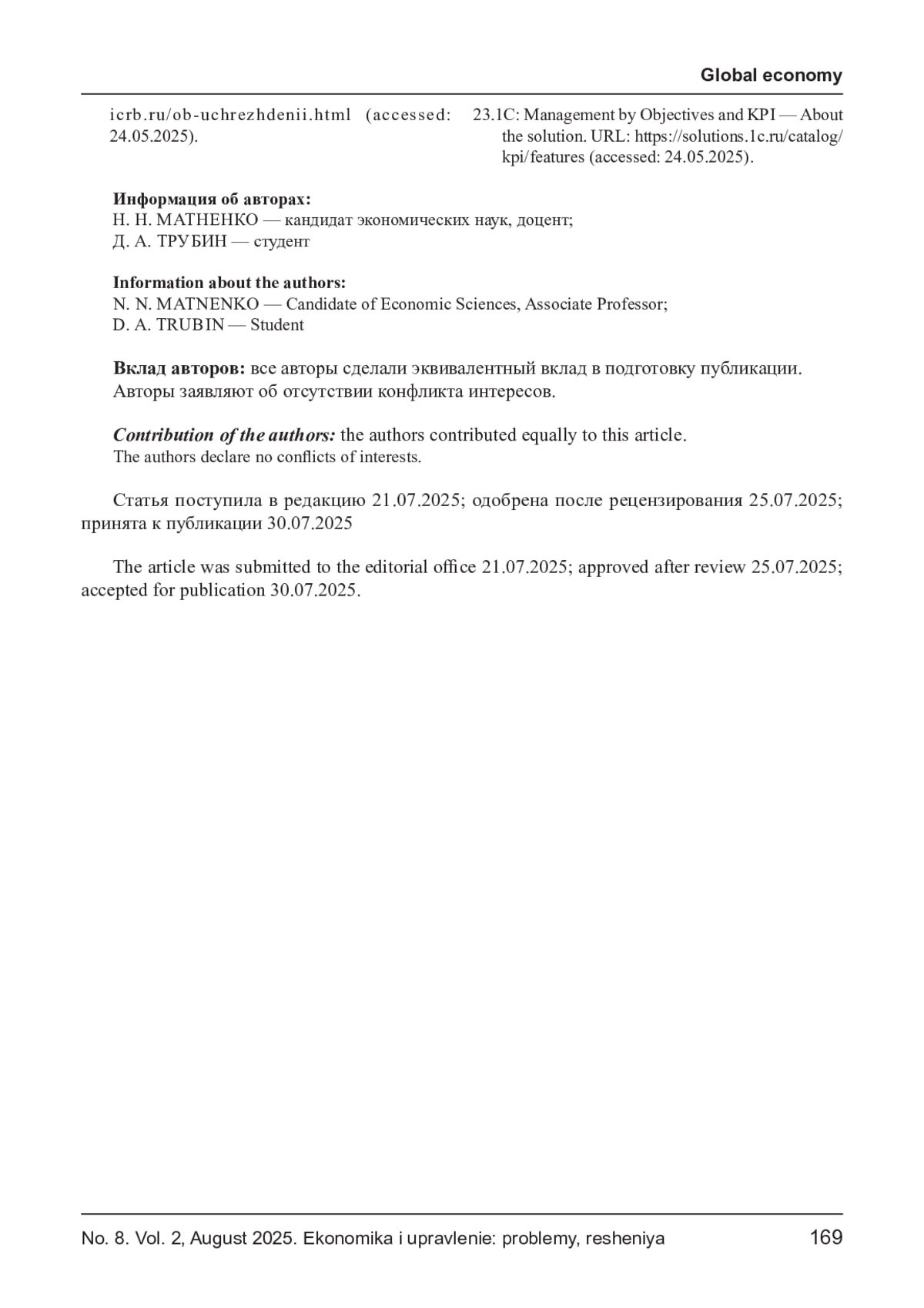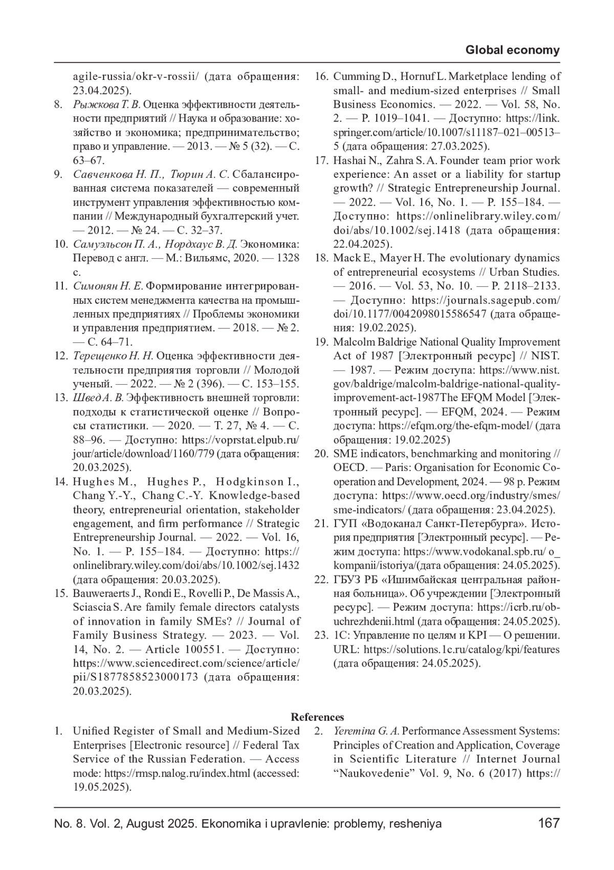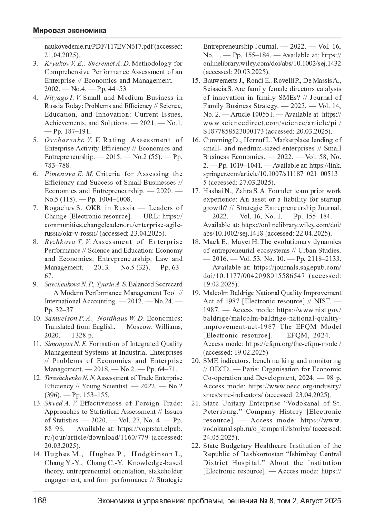 ТРУБИН Д. А., МАТНЕНКО Н. Н. МОДЕЛИ ОЦЕНКИ И ПОВЫШЕНИЯ ЭФФЕКТИВНОСТИ МСП: ОПЫТ, СРАВНИТЕЛЬНЫЙ АНАЛИЗ И ОСОБЕННОСТИ ВНЕДРЕНИЯ // ЭКОНОМИКА И УПРАВЛЕНИЕ: ПРОБЛЕМЫ, РЕШЕНИЯ. 2025. ТОМ 2 № 8