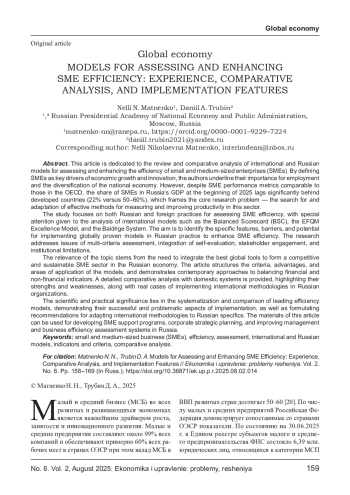 Статья посвящена обзору и сравнительному анализу международных и российских моделей оценки и повышения эффективности малого и среднего бизнеса (МСП). Определяя МСП как ключевой драйвер экономического роста и инноваций, авторы подчеркивают его значимость для занятости и диверсификации национальной экономики. Однако, несмотря на сопоставимые с ОЭСР количественные показатели, доля МСП в ВВП России на начало 2025 г. существенно отстает от развитых стран (22% против 50-60%), что и формулирует основную проблему исследования - поиск и адаптация эффективных методов измерения и повышения производительности данного сектора.
