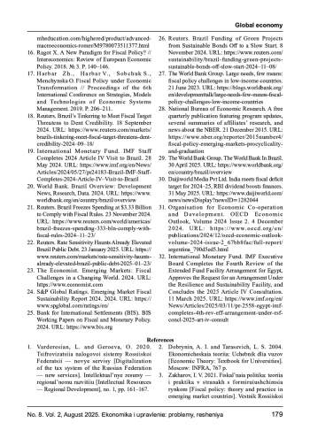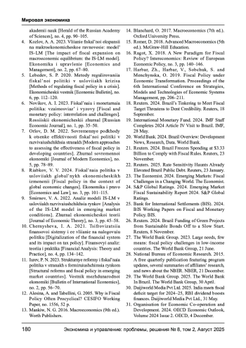 11. Юрьев П. Н. Структурные реформы и фискальная политика в странах с формирующимся рынком // Вестник международной экономики. 2023. № 2. С. 56-70.