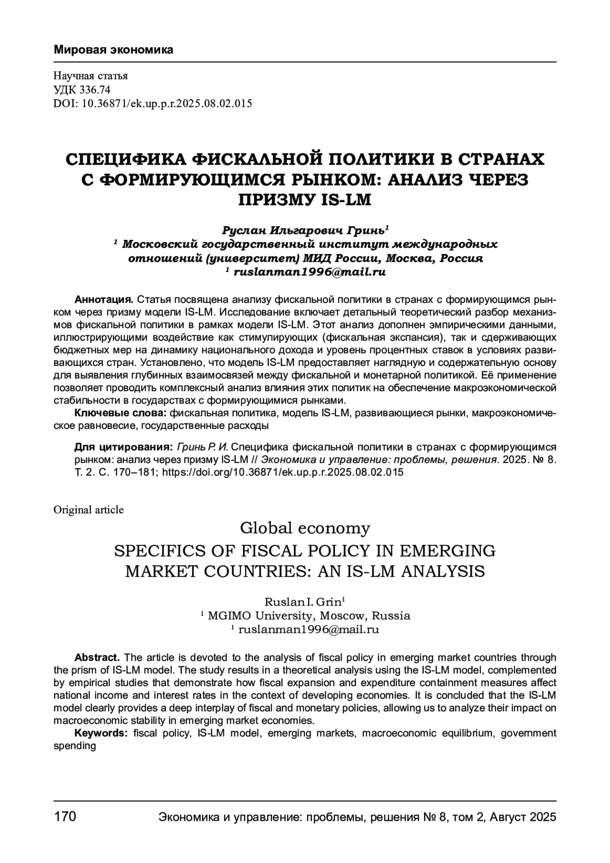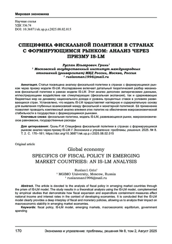 Статья посвящена анализу фискальной политики в странах с формирующимся рынком через призму модели IS-LM. Исследование включает детальный теоретический разбор механизмов фискальной политики в рамках модели IS-LM. Этот анализ дополнен эмпирическими данными, иллюстрирующими воздействие как стимулирующих (фискальная экспансия), так и сдерживающих бюджетных мер на динамику национального дохода и уровень процентных ставок в условиях развивающихся стран. Установлено, что модель IS-LM предоставляет наглядную и содержательную основу для выявления глубинных взаимосвязей между фискальной и монетарной политикой. Её применение позволяет проводить комплексный анализ влияния этих политик на обеспечение макроэкономической стабильности в государствах с формирующимися рынками.