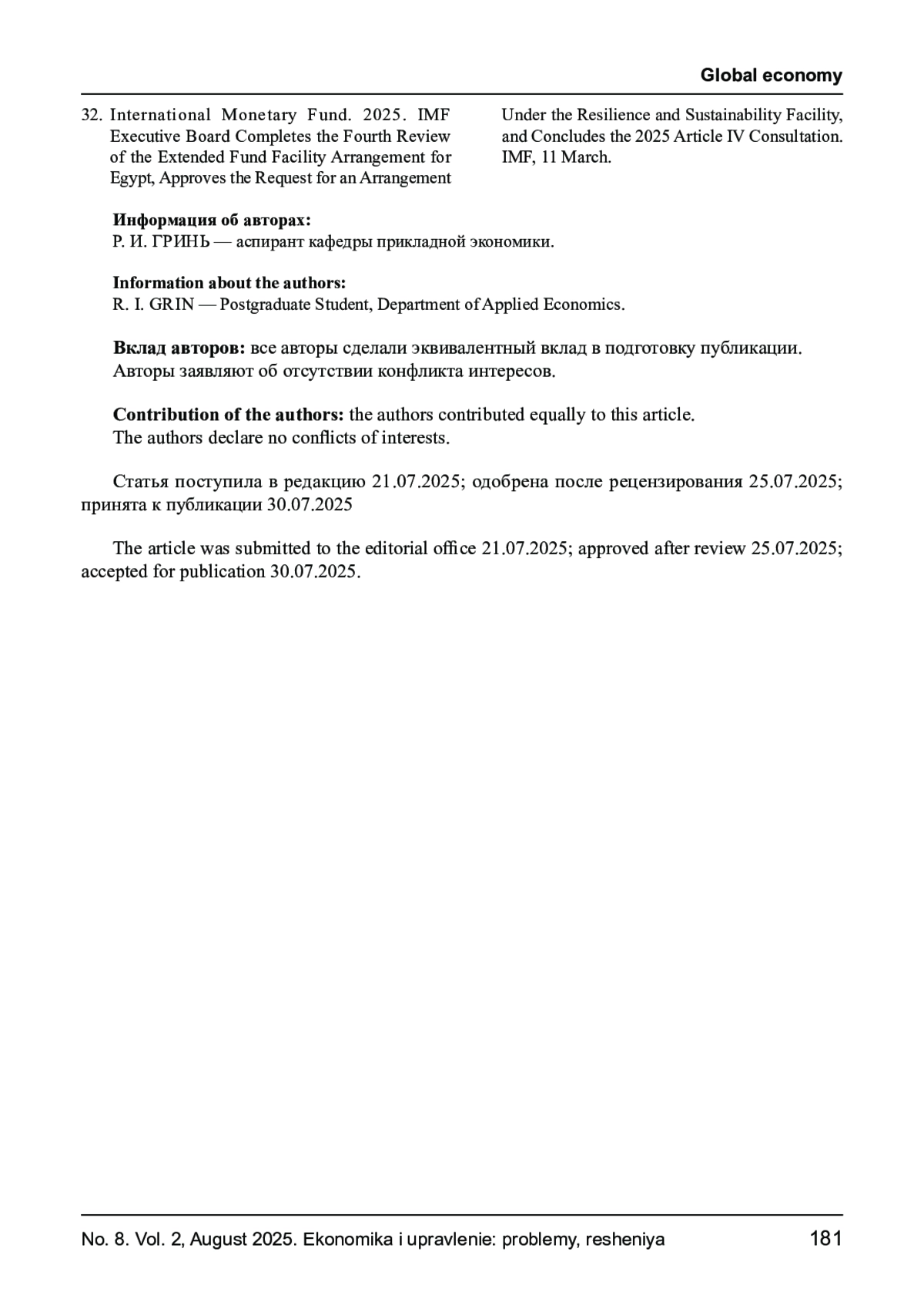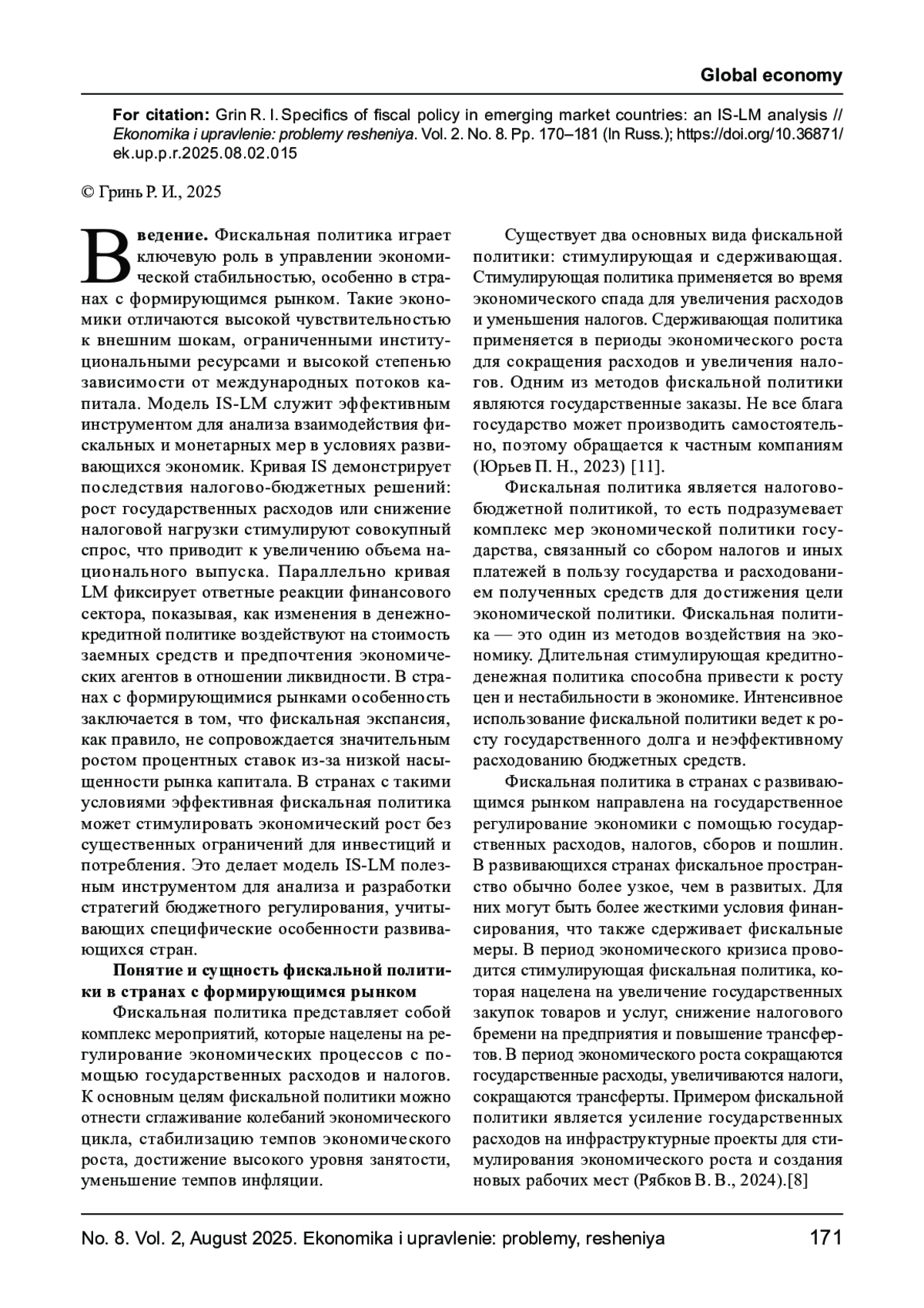 8. Рябков В. В. Фискальная политика в условиях глобальных экономических изменений // Экономика и право. 2024. № 3. С. 101-115.