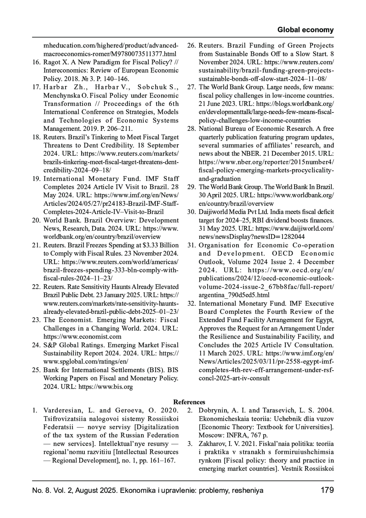 3. Захаров И. В. Фискальная политика: теория и практика в странах с формирующимся рынком // Вестник Российской академии наук. 2021. № 4. С. 90-105.