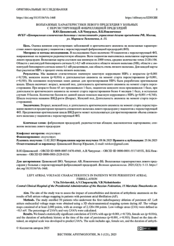 Цель. Оценка влияния сопутствующих заболеваний и аритмического анамнеза на вольтажные характеристики левого предсердия у пациентов с персистирующей фибрилляцией предсердий (ФП).