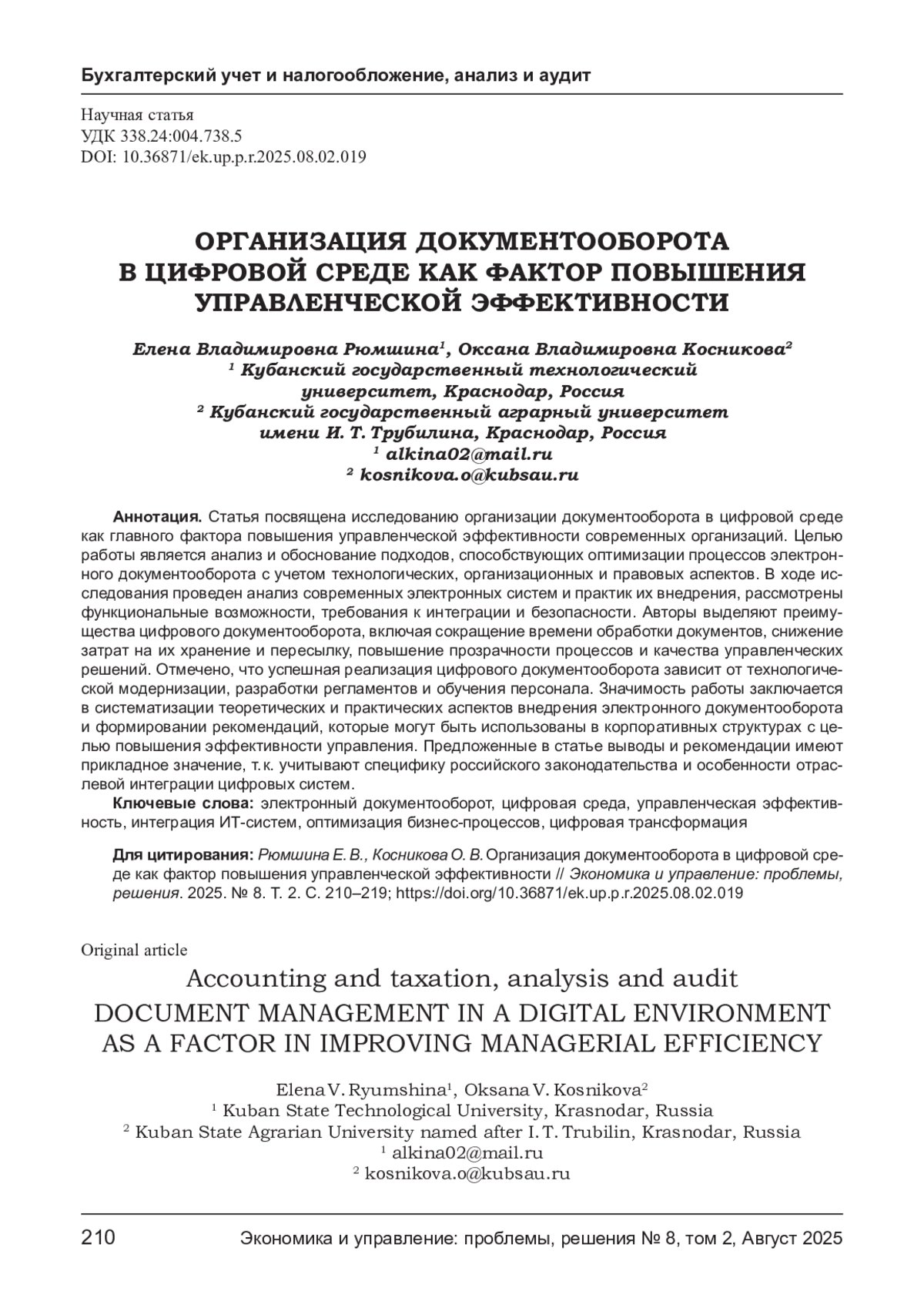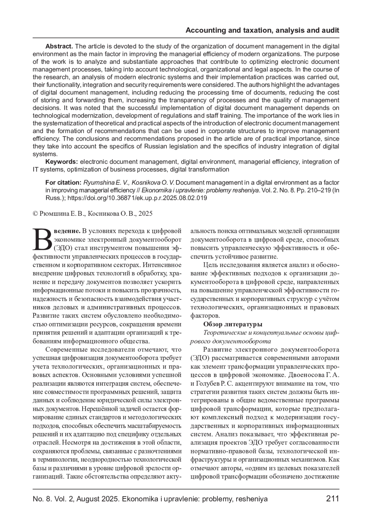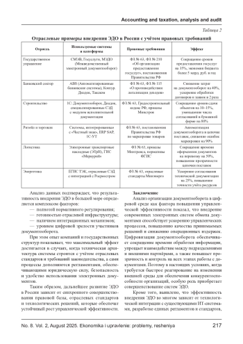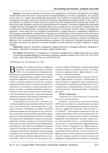 Целью работы является анализ и обоснование подходов, способствующих оптимизации процессов электронного документооборота с учетом технологических, организационных и правовых аспектов. В ходе исследования проведен анализ современных электронных систем и практик их внедрения, рассмотрены функциональные возможности, требования к интеграции и безопасности. Авторы выделяют преимущества цифрового документооборота, включая сокращение времени обработки документов, снижение затрат на их хранение и пересылку, повышение прозрачности процессов и качества управленческих решений. Отмечено, что успешная реализация цифрового документооборота зависит от технологической модернизации, разработки регламентов и обучения персонала. Значимость работы заключается в систематизации теоретических и практических аспектов внедрения электронного документооборота и формировании рекомендаций, которые могут быть использованы в корпоративных структурах с целью повышения эффективности управления. Предложенные в статье выводы и рекомендации имеют прикладное значение, т. к. учитывают специфику российского законодательства и особенности отраслевой интеграции цифровых систем.