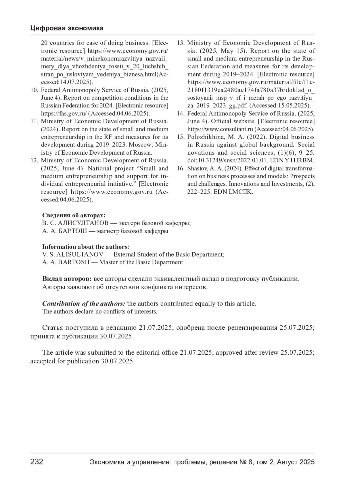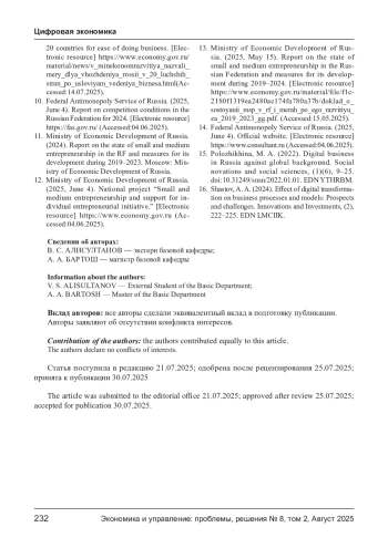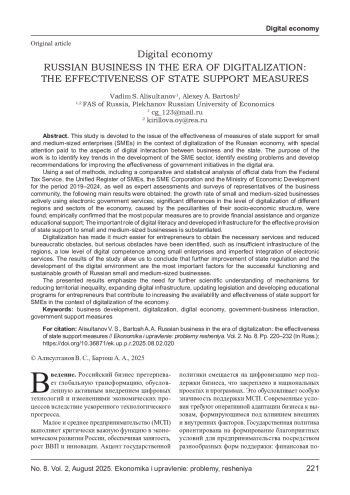 Цифровизация значительно облегчила предпринимателям получение необходимых услуг и уменьшила бюрократические преграды, однако выявлены серьезные препятствия, такие как недостаточность цифровой инфраструктуры в регионах, низкий уровень цифровой компетенции среди малых предприятий и несовершенство интеграции электронных сервисов. Итоги проведенного исследования позволяют сделать вывод о том, что дальнейшее совершенствование государственного регулирования и развитие цифровой среды являются важнейшими факторами успешного функционирования и устойчивого роста российского малого и среднего бизнеса.