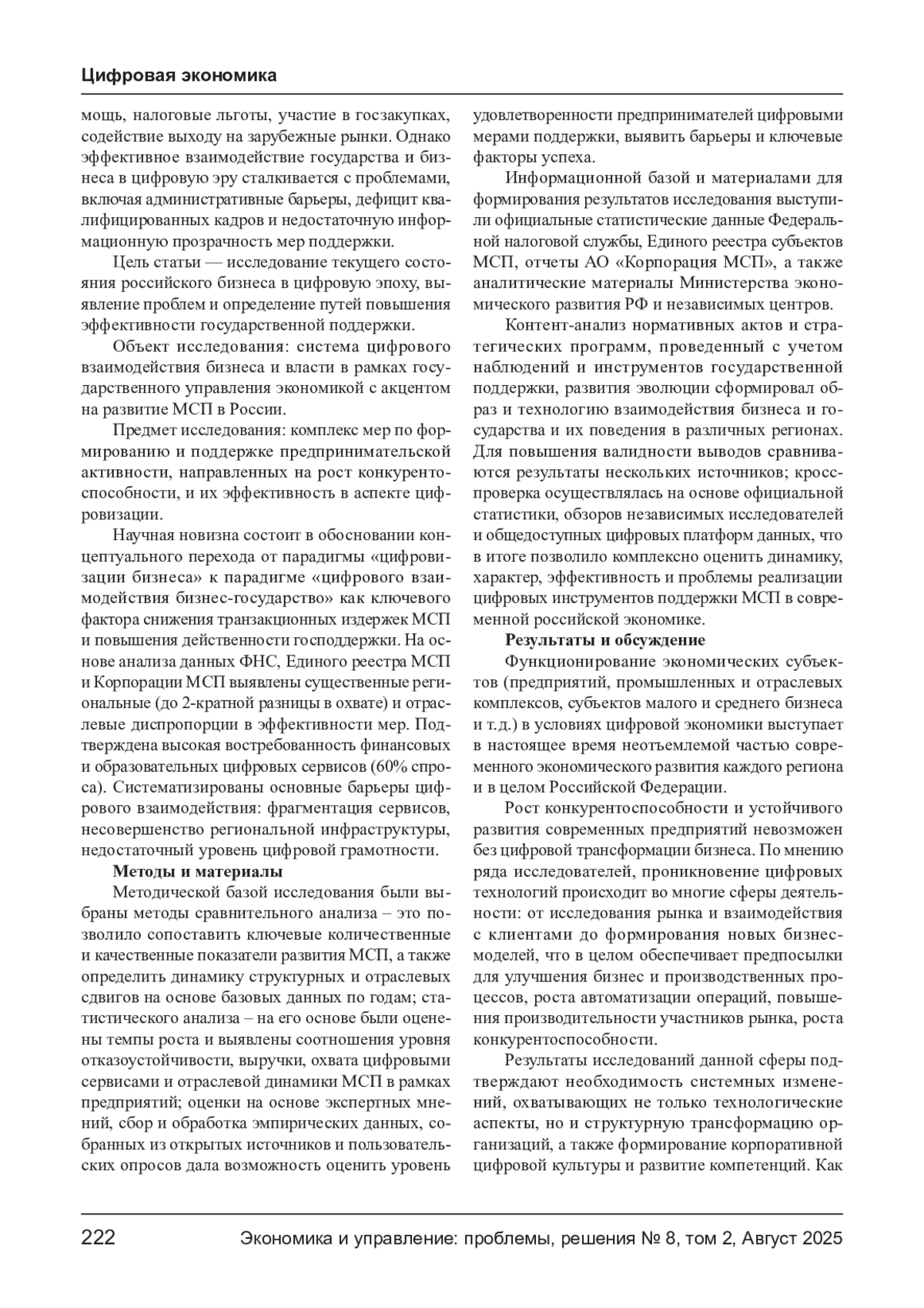 Используя комплекс методов, включающий сравнительный и статистический анализ официальных данных Федеральной налоговой службы, Единого реестра МСП, Корпорации МСП и Министерства экономического развития за период 2019-2024 годов, а также экспертные оценки и опросы представителей предпринимательского сообщества, были получены следующие основные результаты: количественно определены темпы увеличения количества субъектов малого и среднего предпринимательства, активно пользующихся электронными государственными сервисами; обнаружены существенные различия в уровне цифровизации разных регионов и отраслей экономики, вызванные особенностями их социально- экономической структуры; эмпирически подтверждено, что наибольшей популярностью пользуются мероприятия по оказанию финансовой помощи и организации образовательной поддержки; обоснована важная роль цифровой грамотности и развитой инфраструктуры для эффективного предоставления государственной поддержки малому и среднему бизнесу.