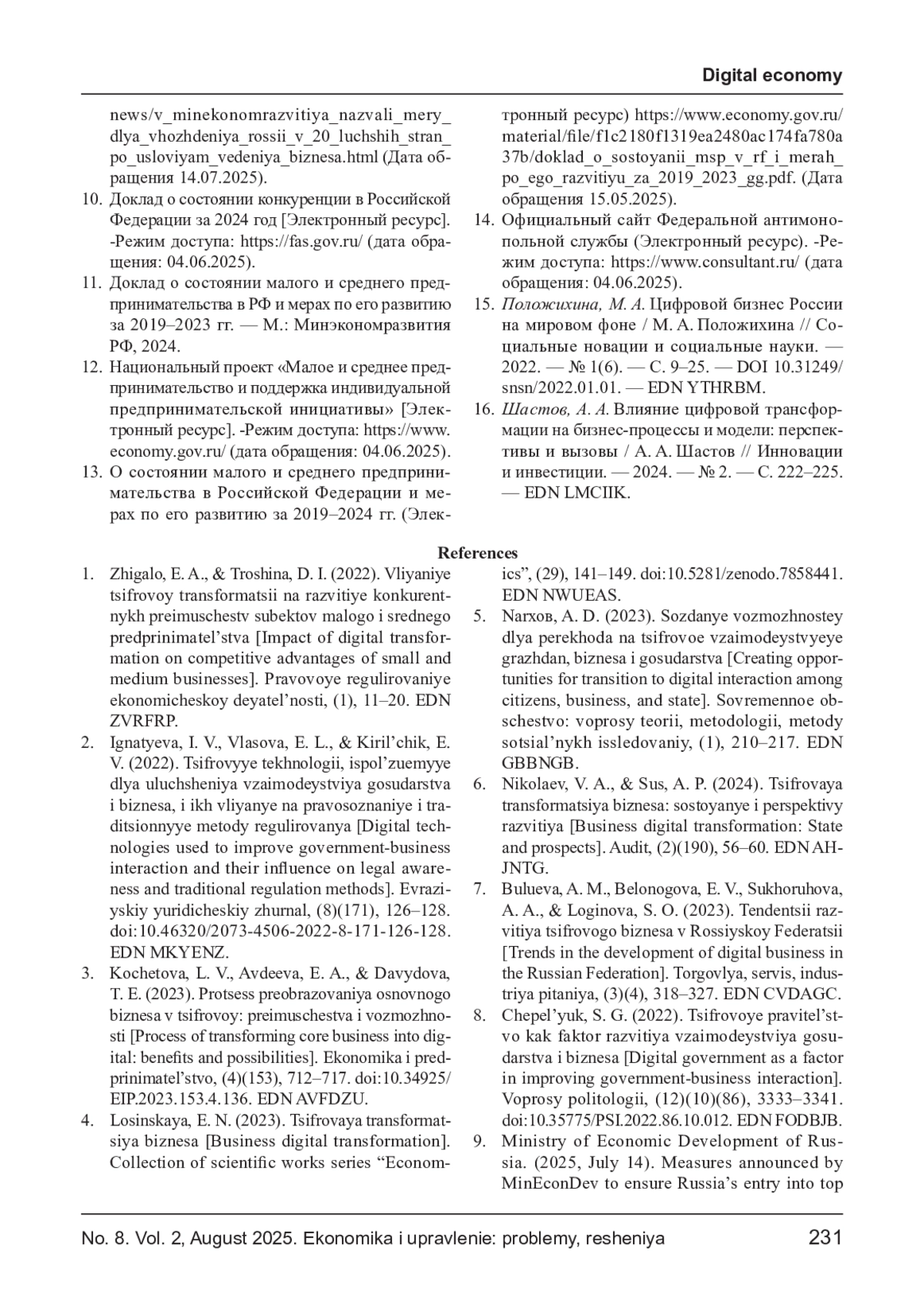 1. Жигало, Е. А. Влияние цифровой трансформации на развитие конкурентных преимуществ субъектов малого и среднего предпринимательства / Е. А. Жигало, Д. И. Трошина // Правовое регулирование экономической деятельности. ПРЭД. - 2022. - № 1. - С. 11-20. EDN: ZVRFRP