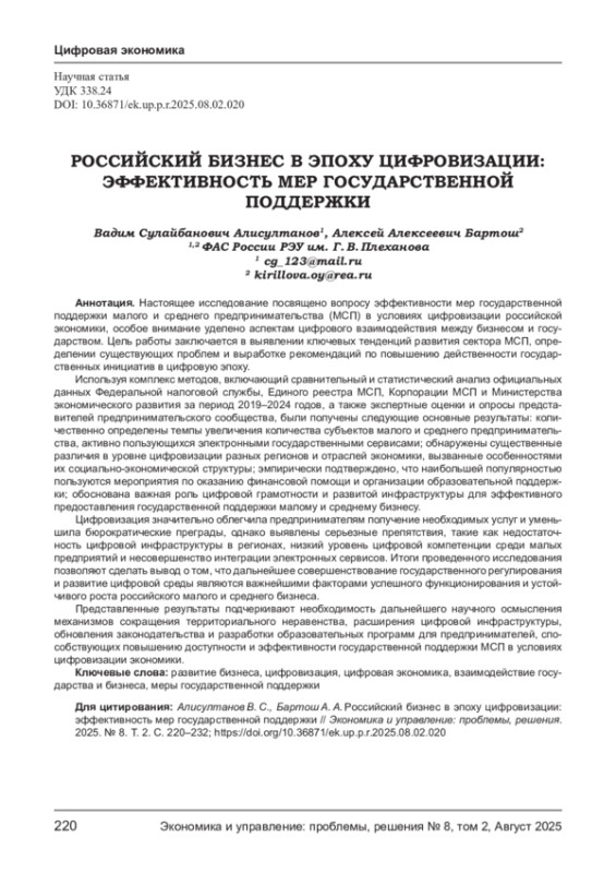 Настоящее исследование посвящено вопросу эффективности мер государственной поддержки малого и среднего предпринимательства (МСП) в условиях цифровизации российской экономики, особое внимание уделено аспектам цифрового взаимодействия между бизнесом и государством.