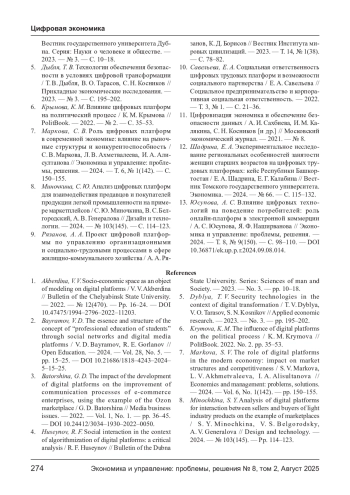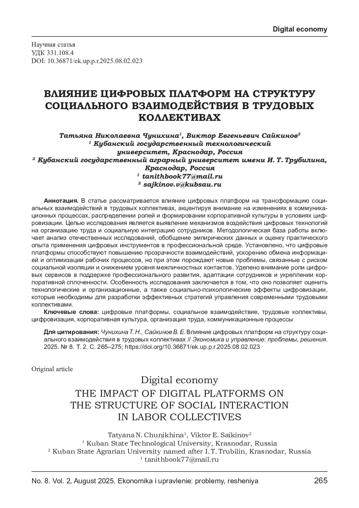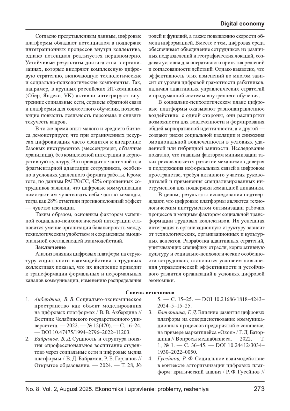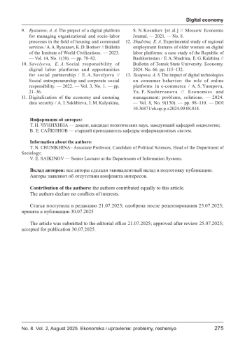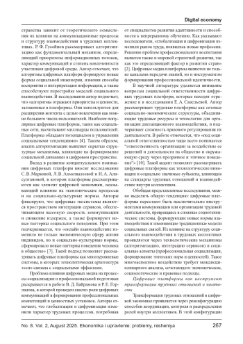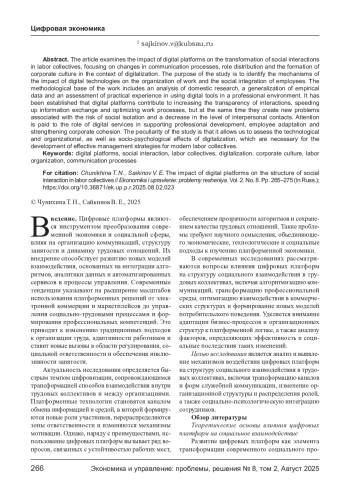 ЧУНИХИНА Т. Н., САЙКИНОВ В. Е. ВЛИЯНИЕ ЦИФРОВЫХ ПЛАТФОРМ НА СТРУКТУРУ СОЦИАЛЬНОГО ВЗАИМОДЕЙСТВИЯ В ТРУДОВЫХ КОЛЛЕКТИВАХ // ЭКОНОМИКА И УПРАВЛЕНИЕ: ПРОБЛЕМЫ, РЕШЕНИЯ. 2025. ТОМ 2 № 8