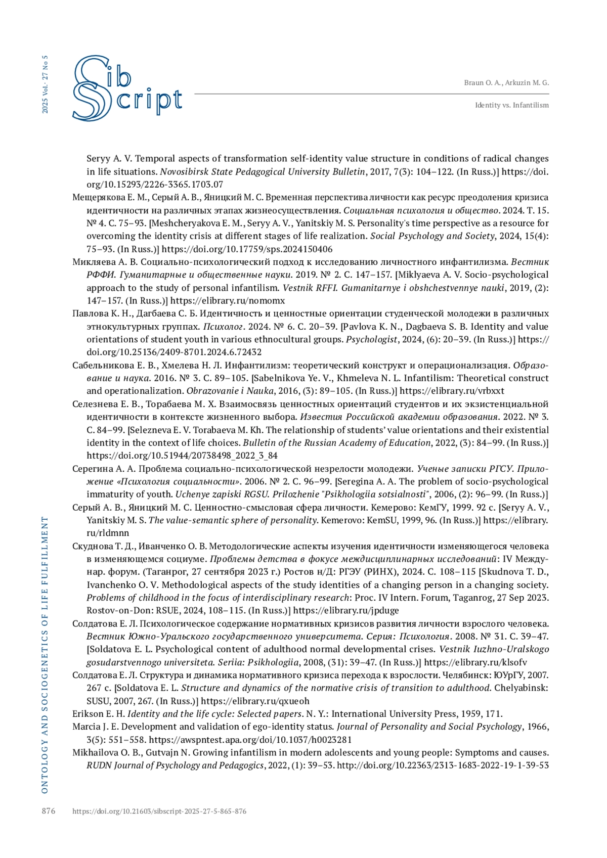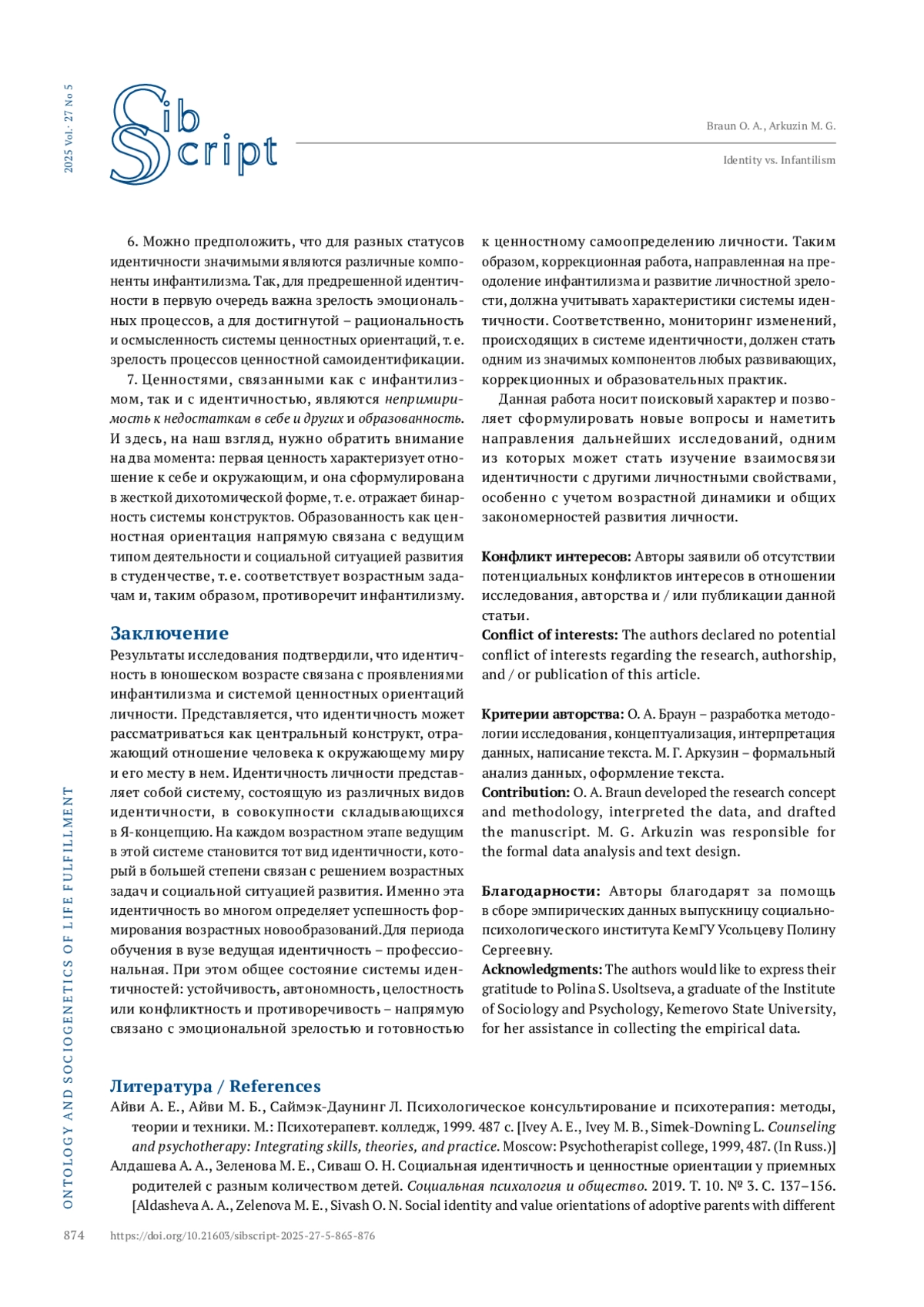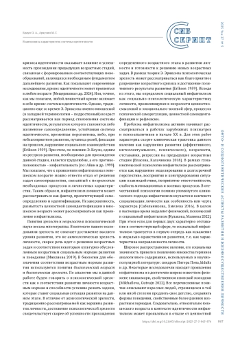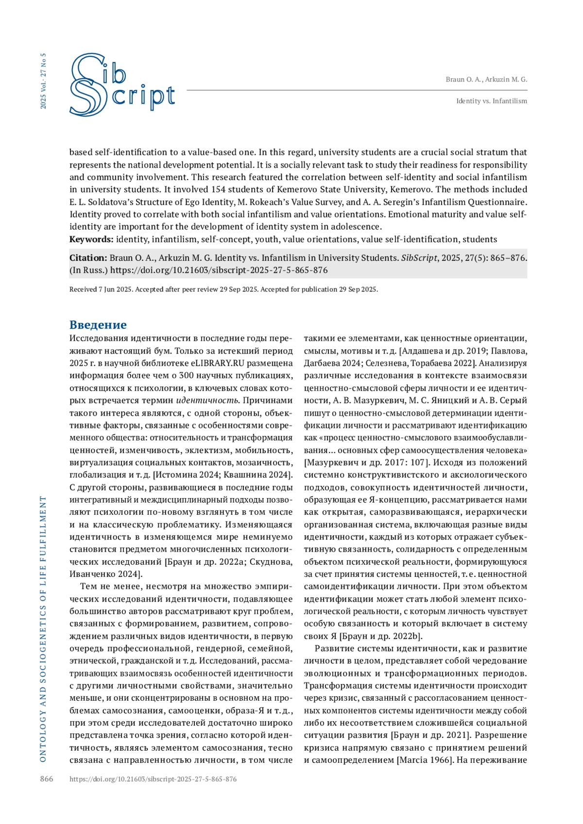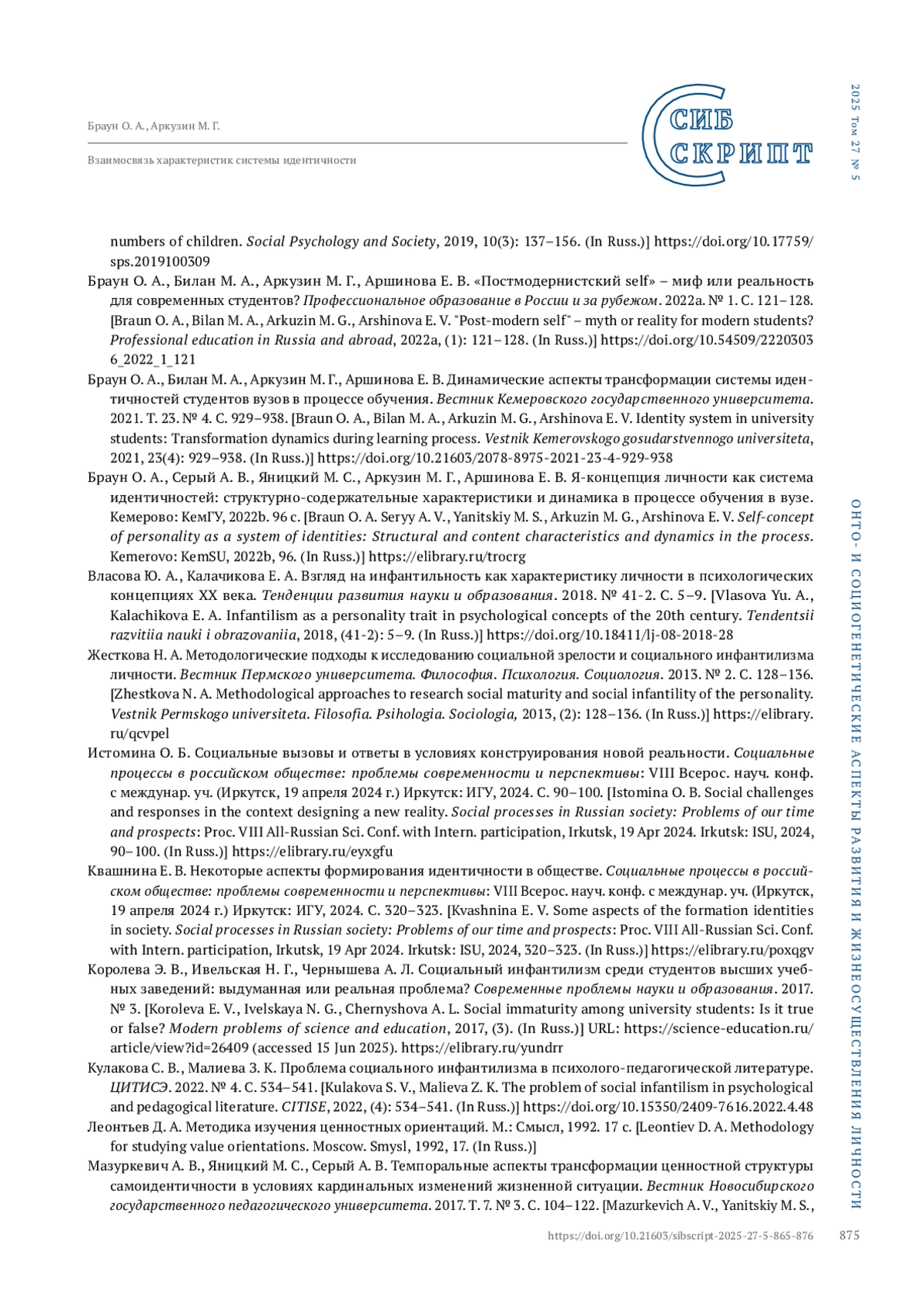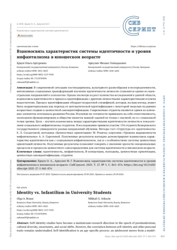 БРАУН О. А., АРКУЗИН М. Г. ВЗАИМОСВЯЗЬ ХАРАКТЕРИСТИК СИСТЕМЫ ИДЕНТИЧНОСТИ И УРОВНЯ ИНФАНТИЛИЗМА В ЮНОШЕСКОМ ВОЗРАСТЕ // СИБСКРИПТ. 2025. Т. 27, № 5