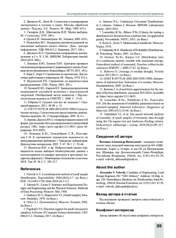15. Волчихин В.И. и др. Нейросетевой анализ нормальности малых выборок биометрических данных с использованием хи-квадрат критерия и критериев Андерсона-Дарлинга // Инженерные технологии и системы. 2019. Том 29. № 2. С. 205-217.