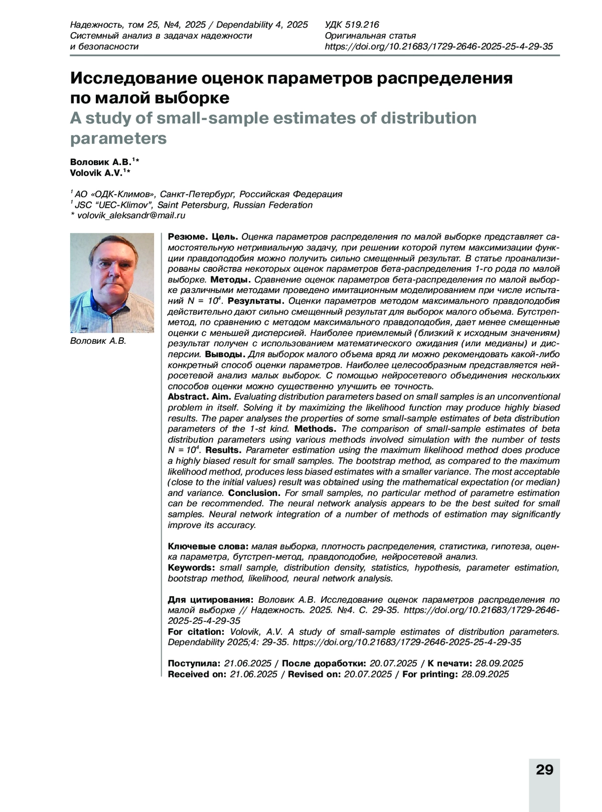 1. Воловик А.В. Комбинаторный способ идентификации малой выборки// Надежность. 2024. № 2. С. 3-7. https://doi.org/10.21683/1729-2646-2024-24-2-3-7