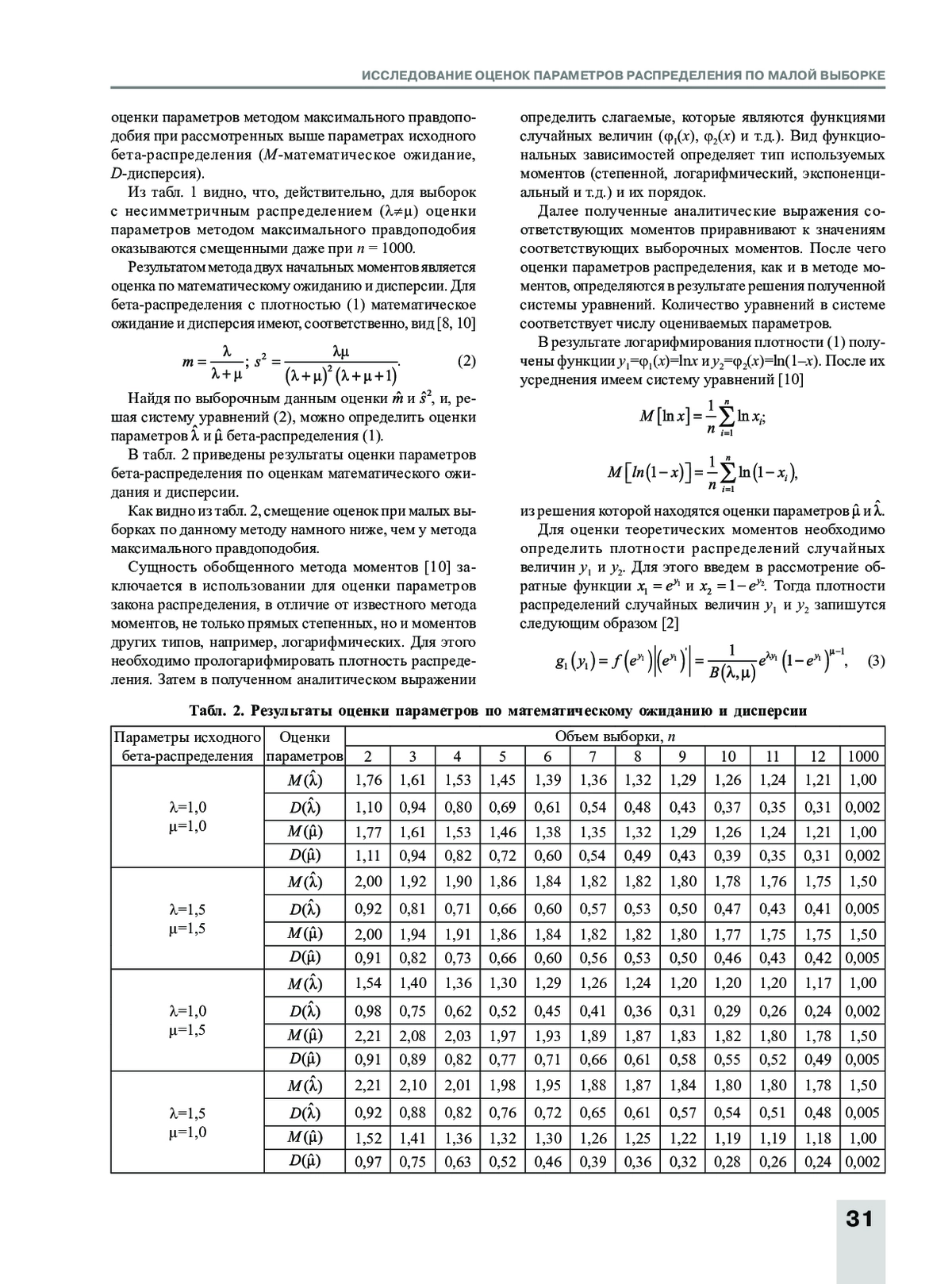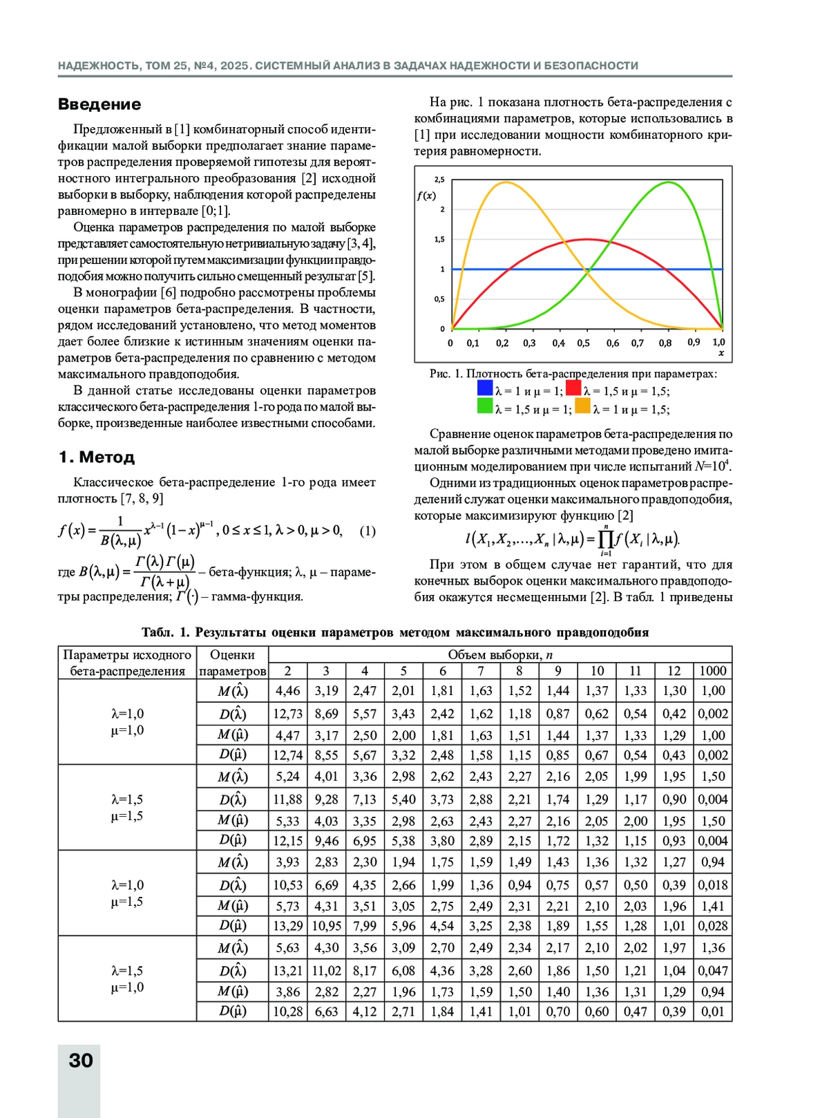 Из табл. 3 видно, что, несмотря на заявленную в [10] «малую погрешность оценивания параметров распределений при малых выборках», для бета-распределения данный метод неприемлем для действительно малых (n < 10) выборок.