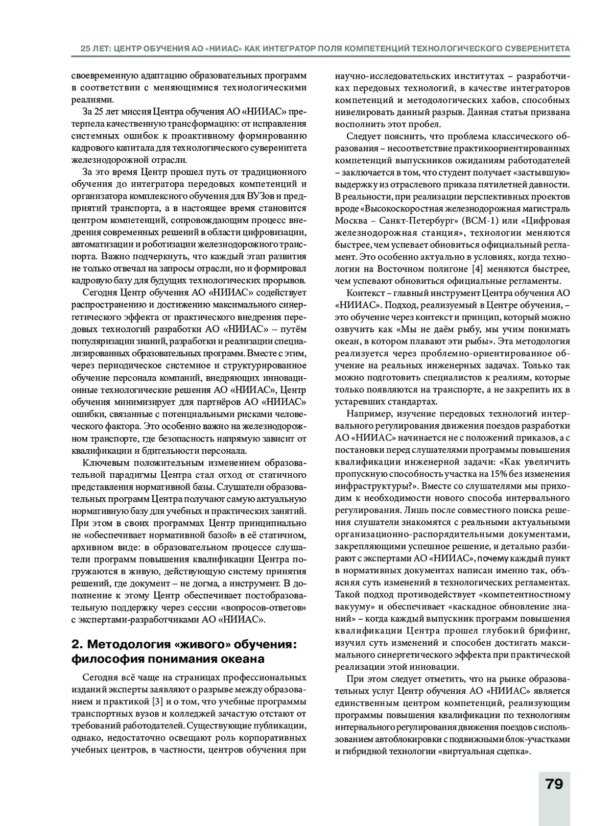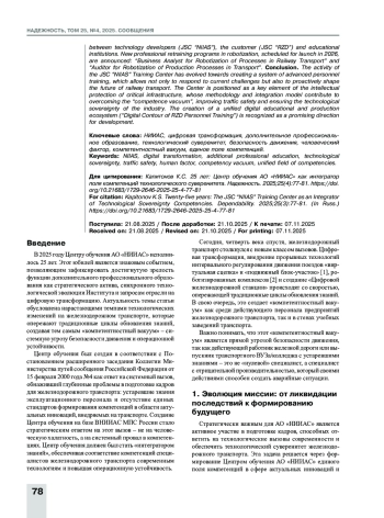 Цель. Анализ эволюции и роли Центра обучения АО «НИИАС» в контексте цифровой трансформации железнодорожной отрасли, преодоления «компетентностного вакуума» и формирования кадрового потенциала для обеспечения технологического суверенитета. Определение методологических основ и перспективных направлений деятельности Центра как интегратора передовых компетенций.