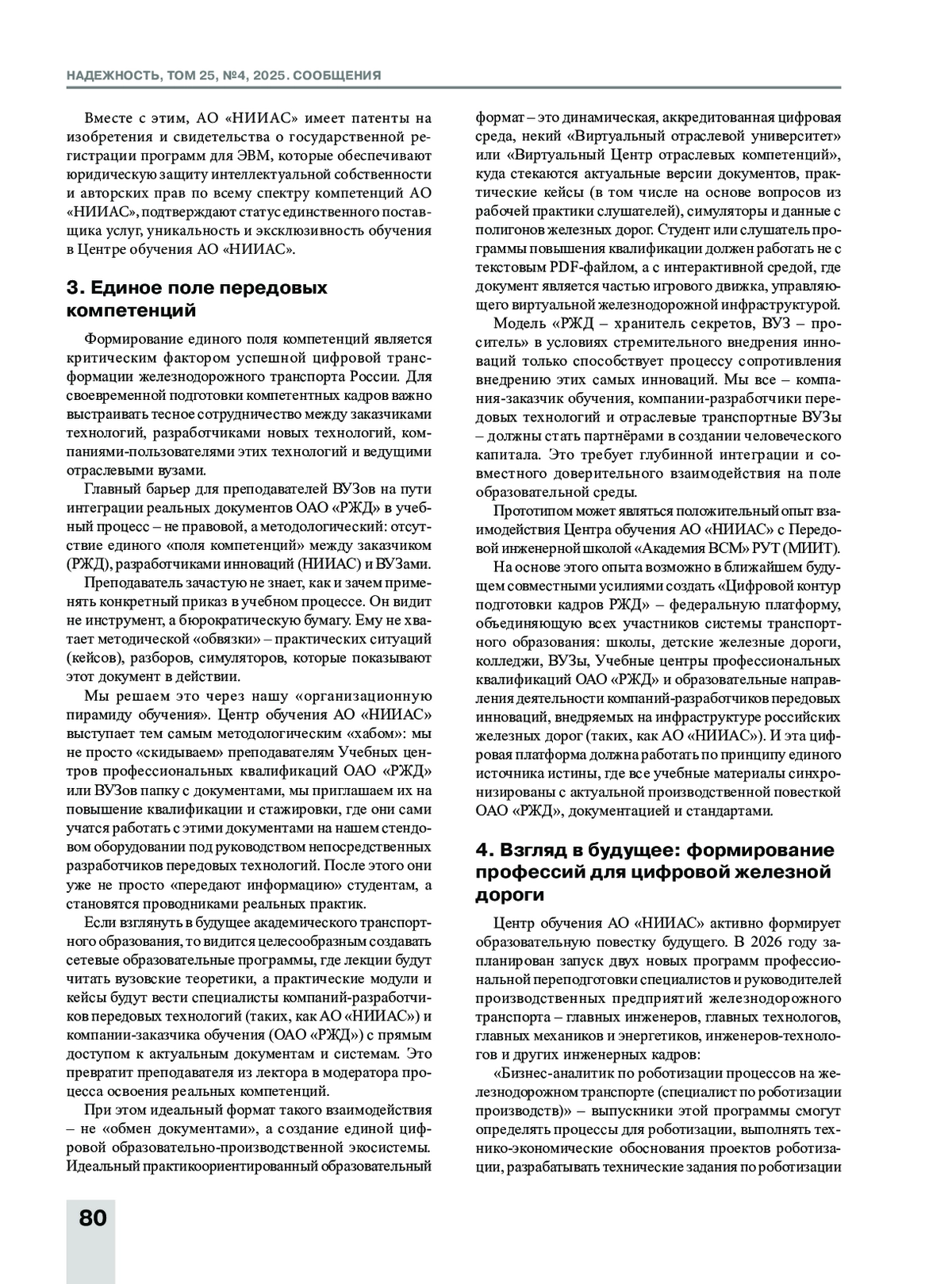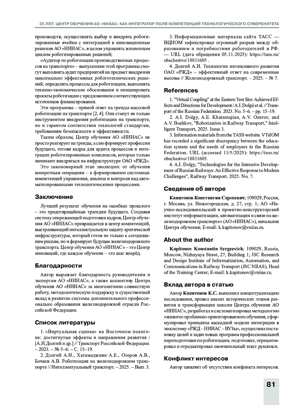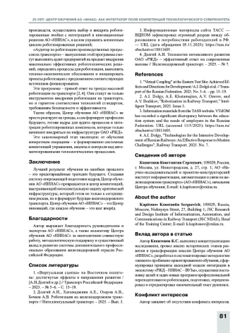 Выводы. Деятельность Центра обучения АО «НИИАС» эволюционировала в направлении создания системы опережающей подготовки кадров, что позволяет не только реагировать на текущие вызовы, но и проактивно формировать будущее железнодорожного транспорта. Центр позиционируется как ключевой элемент интеллектуальной защиты критической инфраструктуры, чья методология и интеграционная модель способствуют преодолению «компетентностного вакуума», повышению безопасности движения и обеспечению технологического суверенитета отрасли. Перспективным направлением развития признано создание единой цифровой образовательно-производственной экосистемы («Цифровой контур подготовки кадров РЖД»).