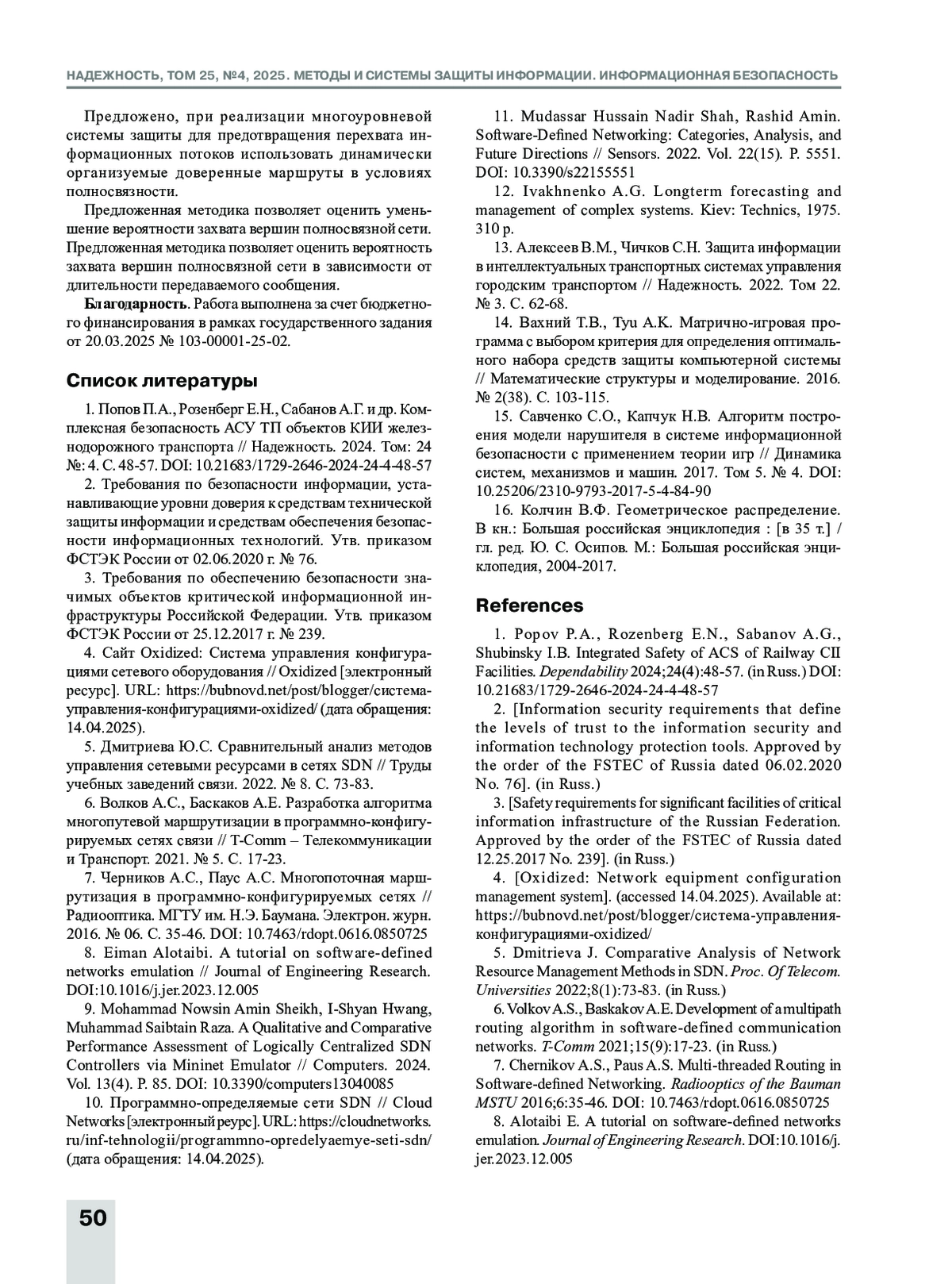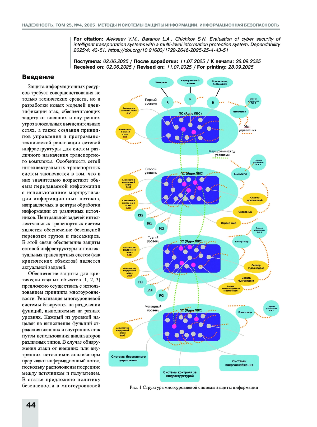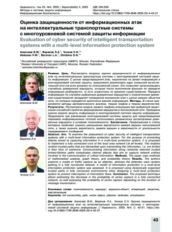 АЛЕКСЕЕВ В. М., БАРАНОВ Л. А., ЧИЧКОВ С. Н. ОЦЕНКА ЗАЩИЩЕННОСТИ ОТ ИНФОРМАЦИОННЫХ АТАК НА ИНТЕЛЛЕКТУАЛЬНЫЕ ТРАНСПОРТНЫЕ СИСТЕМЫ С МНОГОУРОВНЕВОЙ СИСТЕМОЙ ЗАЩИТЫ ИНФОРМАЦИИ // НАДЕЖНОСТЬ. 2025. ТОМ 25, № 4
