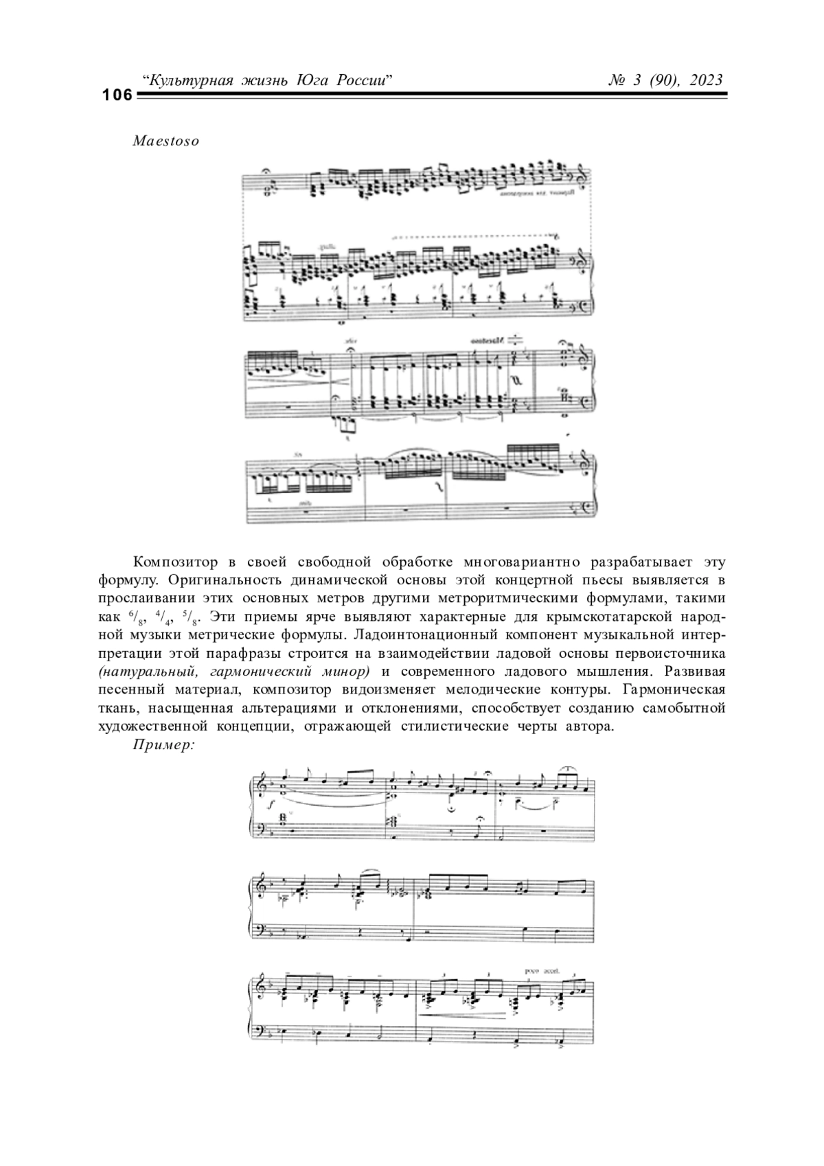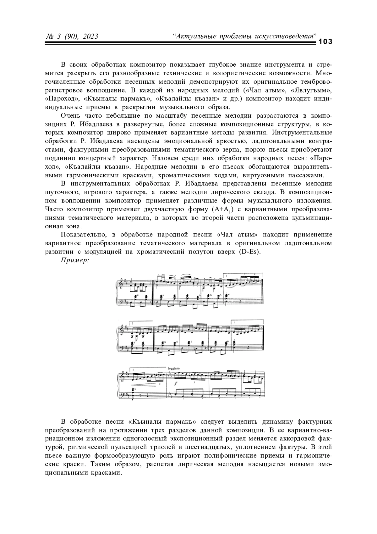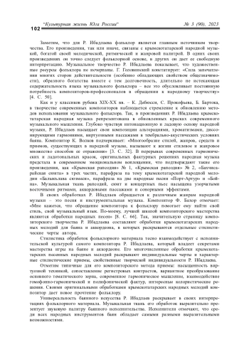 В статье впервые дается стилистическая характеристика творчества крымскотатарского композитора и исполнителя Рефата Ибадлаева. Особое внимание удел ено музыкально-выразительным компонентам, раскрывающим фольклорную основу его произведений. В статье выявлена жанровая специфика творчества композитора, отмечены типичные для его композиторского метода приемы: вариантность, импровизационность. Аналитический материал сопровождается нотными примерами. Современные гармонические и ладоинтонационные средства и композиционные приемы позволили автору выявить новые качества фольклорного материала
