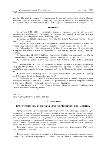 Программность, пронизывающая все творчество Н. К. Метнера, особенно ярко проявилась в жанре сказки. В статье предлагается разделение сказок на группы по определенным образно-жанровым характеристикам. Рассматриваются принципы раскрытия названий и эпиграфов в музыкальном воплощении пьес. Анализируются средства музыкальный выразительности, свойственные той или иной группе сказок. Приводятся примеры приемов композиторской техники, воплощающих программный замысел Н. К. Метнера.